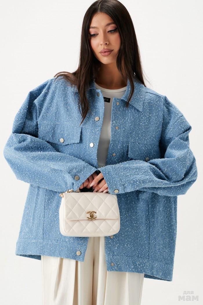 Жакет укороченный. Выполнен из джинсовой ткани голубого цвета. Отложной воротник. Рукав втачной, немного спущен, с широкой манжетой без застёжки. По переду накладные карманы с клапаном из эко-меха в молочном цвете. Застёжка центральная - пуговицы. По низу изделия отрезная планка-пояс, на планке хлястик с кнопками. Спинка отрезная, с фигурной кокеткой. Длина рукава от линии втачивания 52 см. Длина спинки 46,5 см