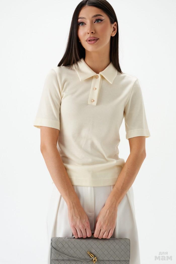 Джемпер прямого кроя. Выполнен из трикотажного полотна белого цвета. Отложной воротник. В области горловины застежка на планке на петли пуговички. Рукав втачной, короткий, длина рукава от края горловины 37 см. Длина спинки от края горловины 55 см
