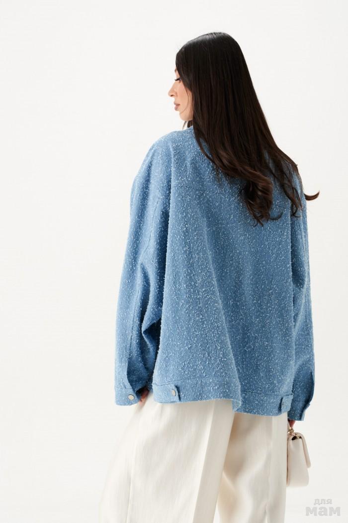 Жакет свободного кроя. Выполнен из джинсовой ткани серого цвета на люрексной основе с перфорацией и пайетками. Воротник отложной. Рукав втачной, немного спущен. На рукаве манжета с кнопкой. Застежка центральная - кнопки. На уровне линии груди карманы с клапаном, внизу карманы с листочкой. Спинка отрезная. По низу изделия отрезная планка-пояс. На планке два хлястика с кнопками. Изделие без подкладки. Длина спинки 71 см. Длина рукава от линии втачивания 60 см