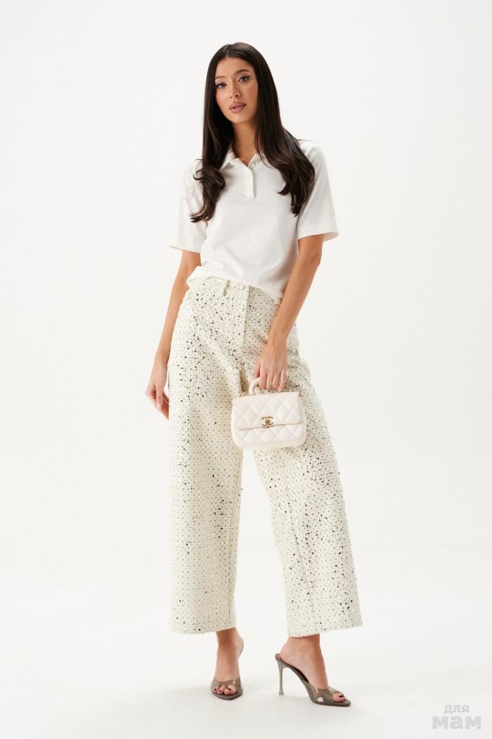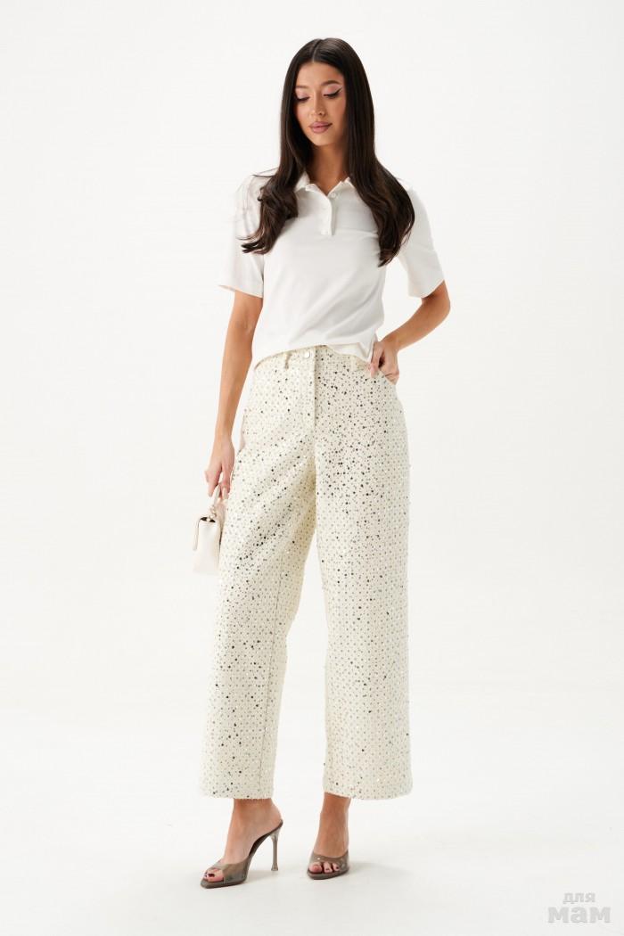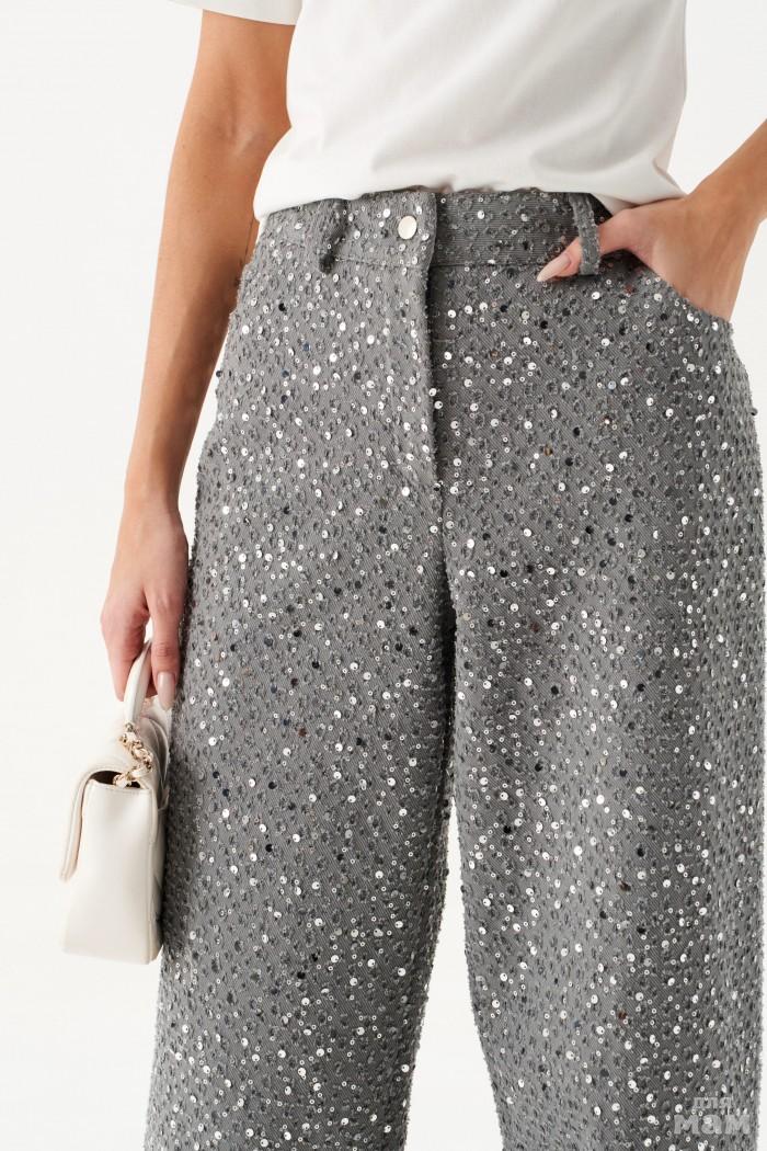 Брюки прямого кроя, выполнены из джинсовой ткани на люрексной основе с перфорацией и пайетками. Характеристика: прямой крой, стабильный пояс на петлю пуговицу с молнией. Блина брюк по боковому шву 111см.