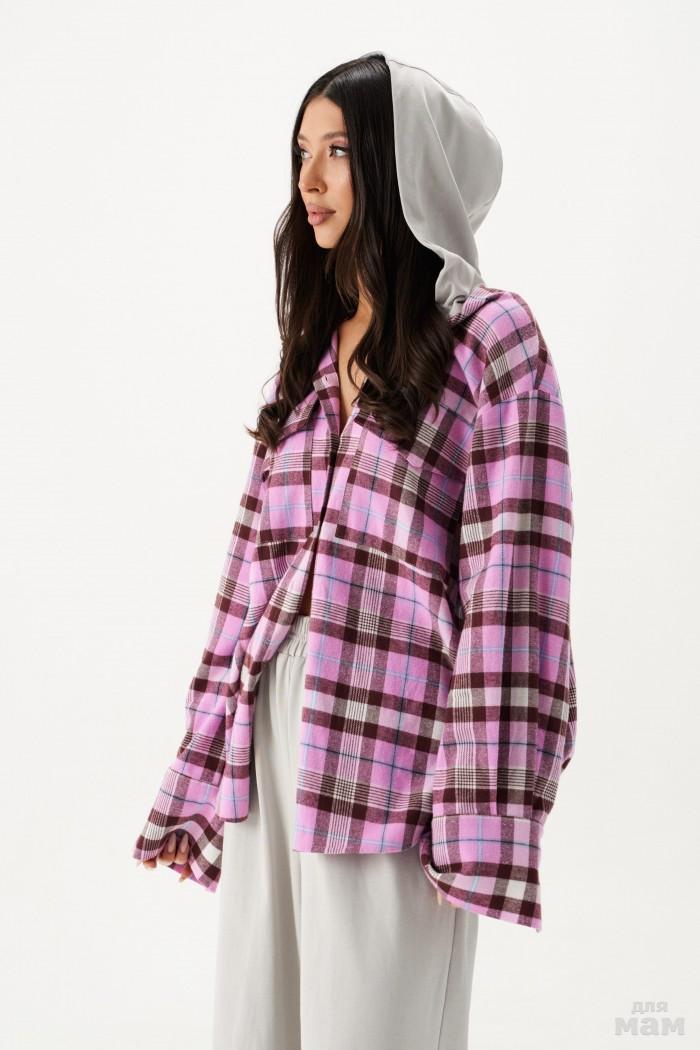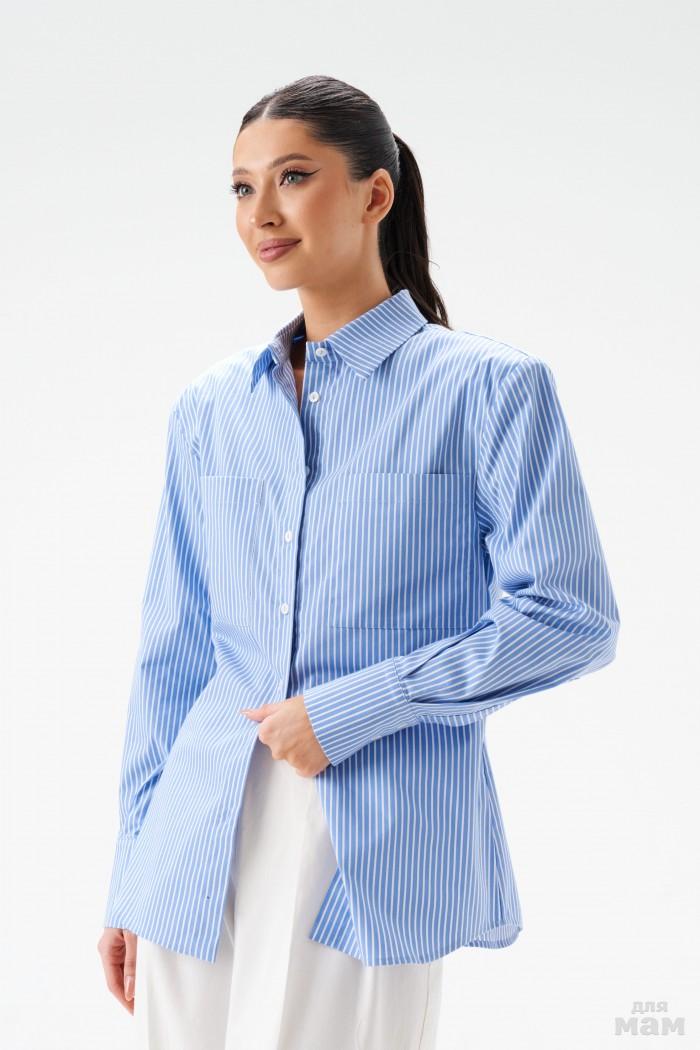 Рубашка прямого кроя. Воротник отложной с лацканами. В области груди накладные карманы с клапанами. В боковых швах разрезы. Застёжка - центральная петли-пуговицы. Рукав втачной, немного спущен. Манжета широкая, без фурнитуры. Длина спинки 68 см, длина рукава 58,5 см