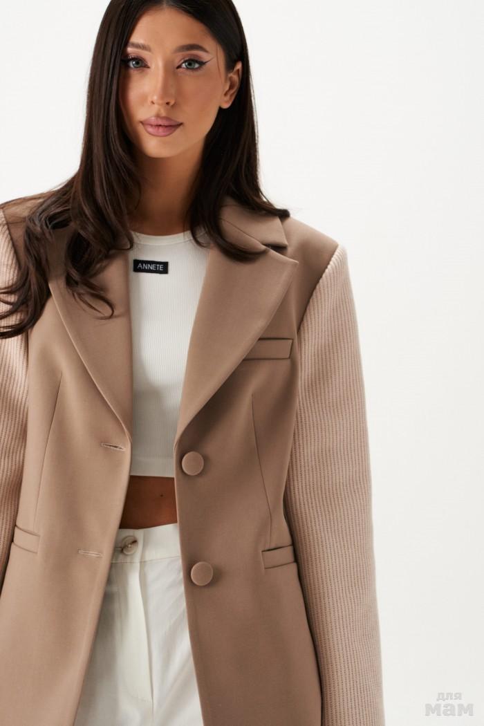 Жакет полуприлегающего силуэта выполнен из костюмной ткани в цвете капучино. Характеристики: полуприлегающий силуэт, подкладка и подплечники, V-образный вырез горловины, талиевые выточки по переду и спинке изделия. Застежка на петли пуговицы, рукав втачной, по переду прорезные карманы, борта жакета с плавным срезом. Длина изделия 52 см, длина рукава 59 см.