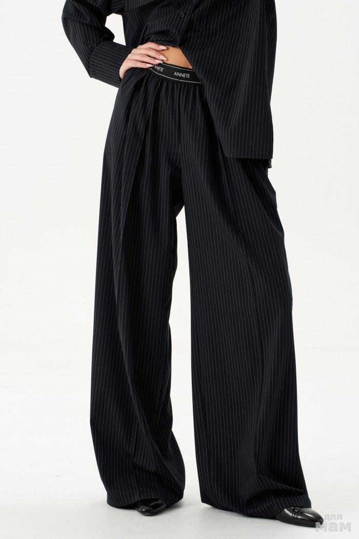 Брюки прямого кроя выполнены из ткани темно-синего цвета в тонкую полоску. Характеристики: прямой крой, эластичная брендированная резинка, боковые карманы, на передних и задних частях брюк застрочены складки и заутюжены стрелки. Длина брюк 114 см.