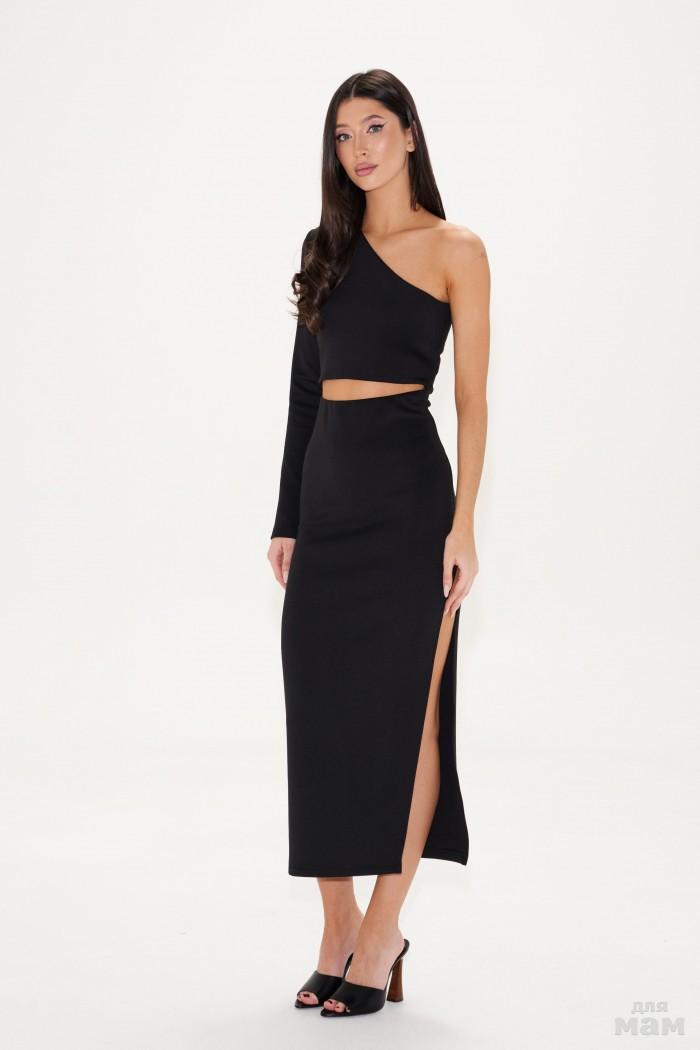 Платье на одно плечо выполнено из трикотажа черного цвета. Характеристка: платье на одно плечо с фигурным разрезом на талии по переду изделия, разрез по бокову шву - 63см. Длина рукава от края горловины - 74см, длина платья по спинке от плеча 132см.