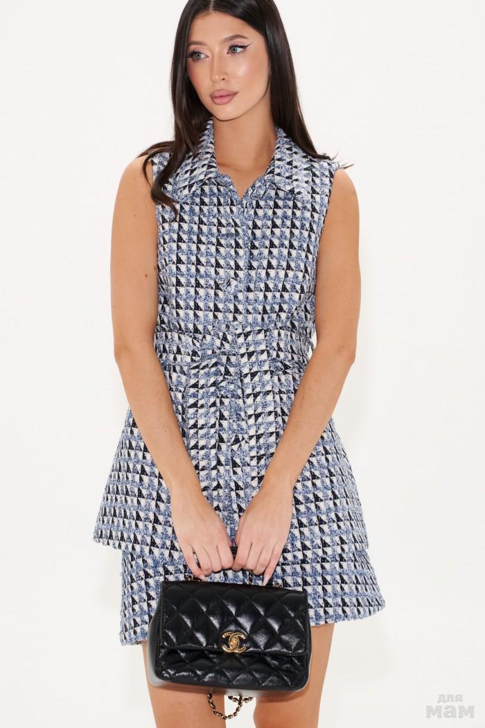 Платье прямого кроя. Выполнено из твида светлого-голубого цвета. Горловина овальная. Застежка потайная молния в среднем шве заднего полотна изделия. Платье на подкладке. Длина спинки 79 см