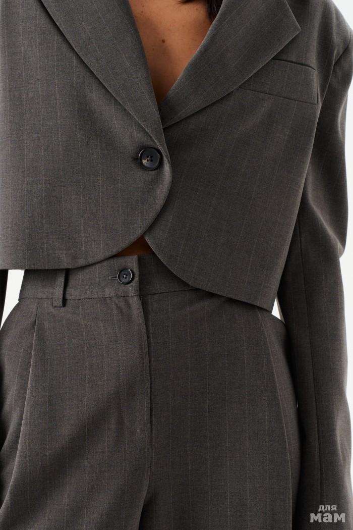 Стильный укороченный жакет выполнен из ткани выполнен из костюмной ткани темно-серого цвета в тонкую полоску. Характеристики: укороченный, подкладка, подплечники, отложной воротник с остроугольным лацканом, застежка центральная - петля пуговица, низ изделия с плавным срезом, рукав втачной по низу рукава нашиты пуговички. Длина по спинке от края горловины 44, длина рукава от края горловины 78 см.