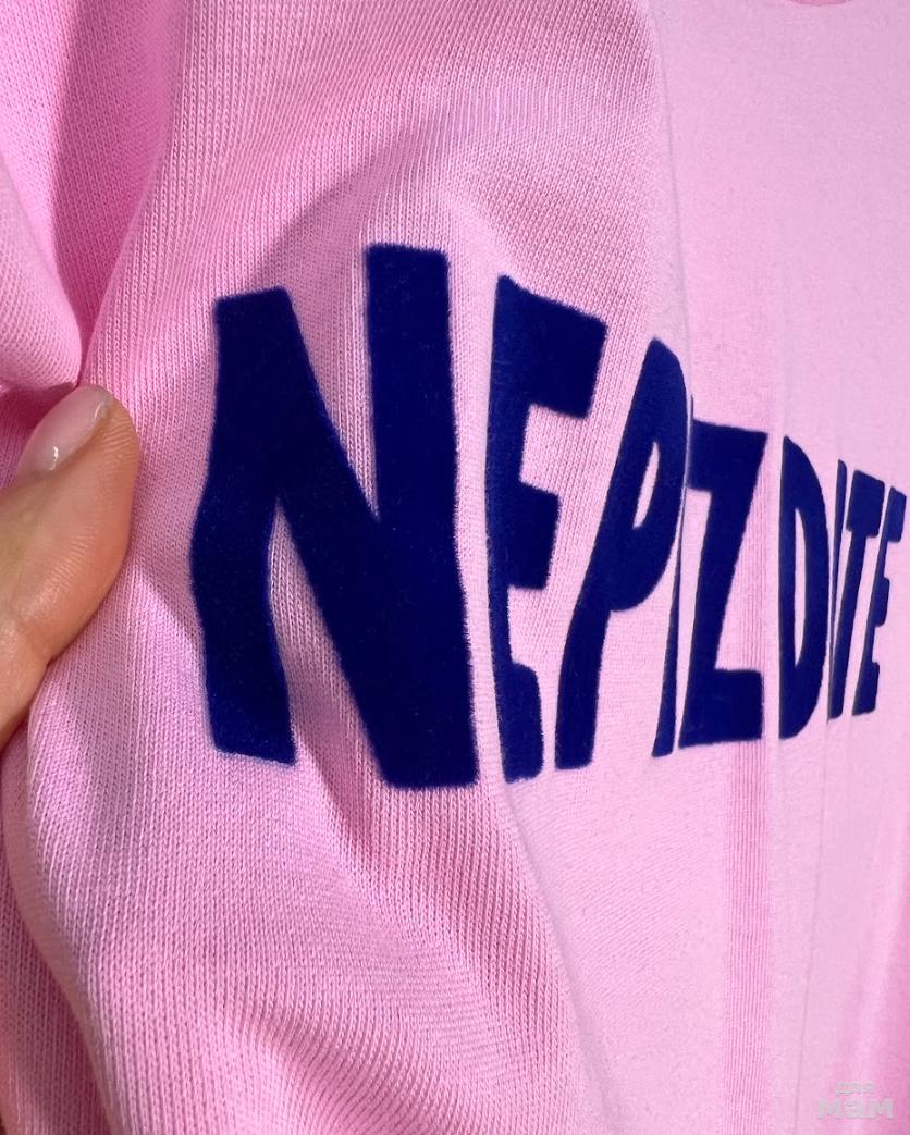 Футболка оверсайз выполнена из плотного хлопкового трикотажного полотна (интерлок). Спущенная линия плеча. Короткий рукав. Горловина круглая с притачной планкой. Дизайнерский принт “NEPIZDITE” (выполнен черничным флоком) на передней половинке футболки.