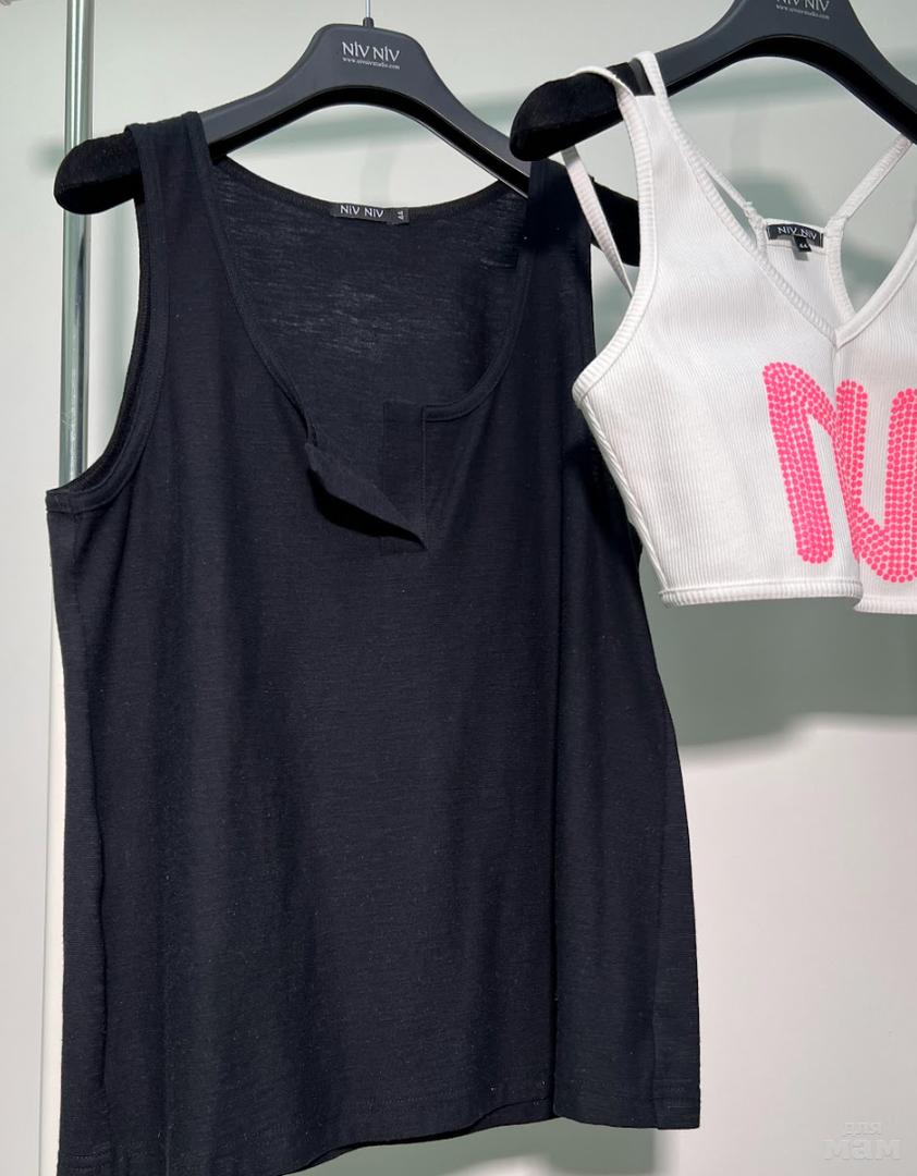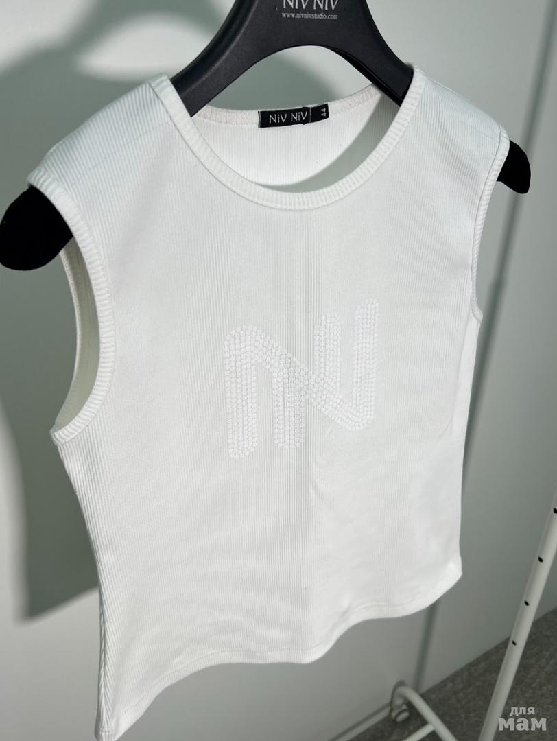 Топ выполнен из трикотажного полотна в рубчик. Изделие приталенное. Горловина круглая. На полочке дизайнерский принт”NN”