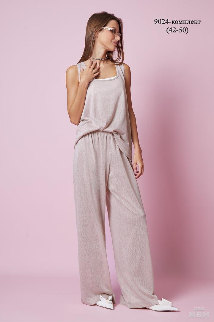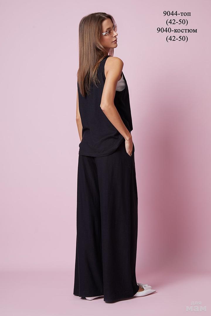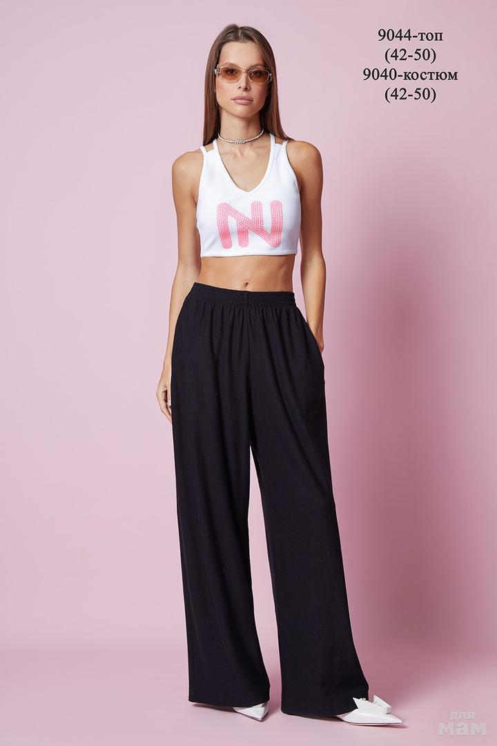 Брюки свободного кроя, прямые, на резинке. Карманы в боковых швах. Топ свободного кроя. Углубленная пройма, круглая горловина с притачной планкой по центру