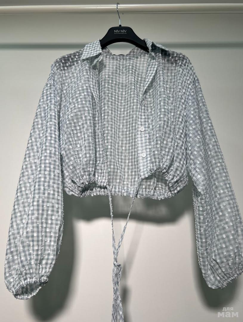 Укороченная рубашка в клетку. Изделие длиной до линии талии без застежки. Низ рубашки на кулисе, в которую вставлен шнурок. Перед и спинка изделия прямые. Спущенная линия плеча. Рукав длинный объемный. Низ рукава на резинке. Рубашечный воротник