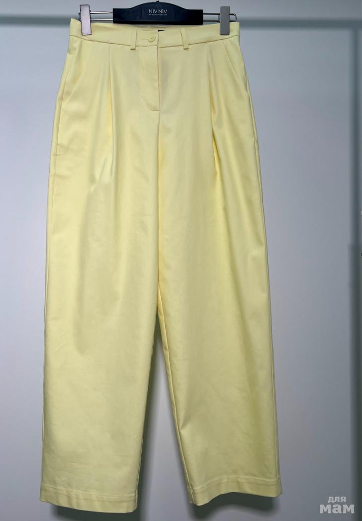 Брюки прямые, достаточно объемные, на резинке. По переду выполнена декоративная строчка. Низ брюк с широкой подгибкой, в которую вставлена резинка (возможна регулировка брюк по ширине) В боковых швах карманы.
