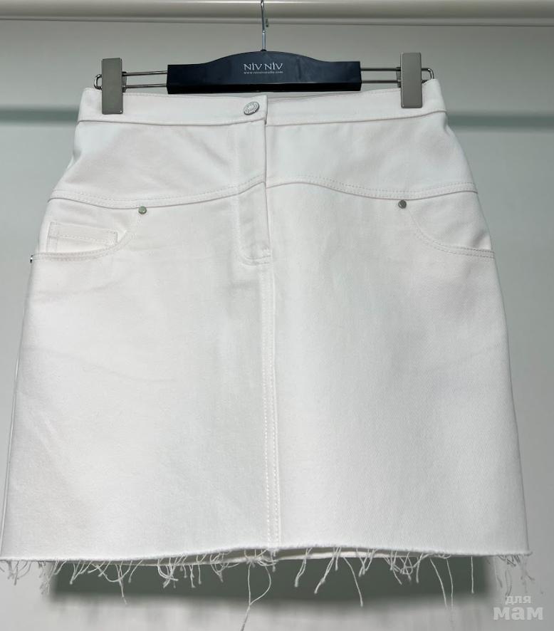Джинсовая юбка длина мини. Юбка на поясе со шлевками. Застежка спереди. Кокетка и фигурные карманы на передних половинках. Сзади в юбке средний шов, фигурная кокетка и накладные карманы. Низ изделия необработан.