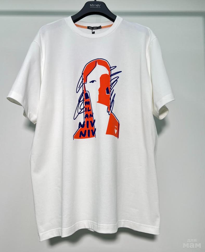 Футболка оверсайз выполнена из плотного хлопкового трикотажного полотна ( интерлок). Спущенная линия плеча. Короткий рукав. Горловина круглая с притачной планкой. Дизайнерский принт на передней половинке футболки.