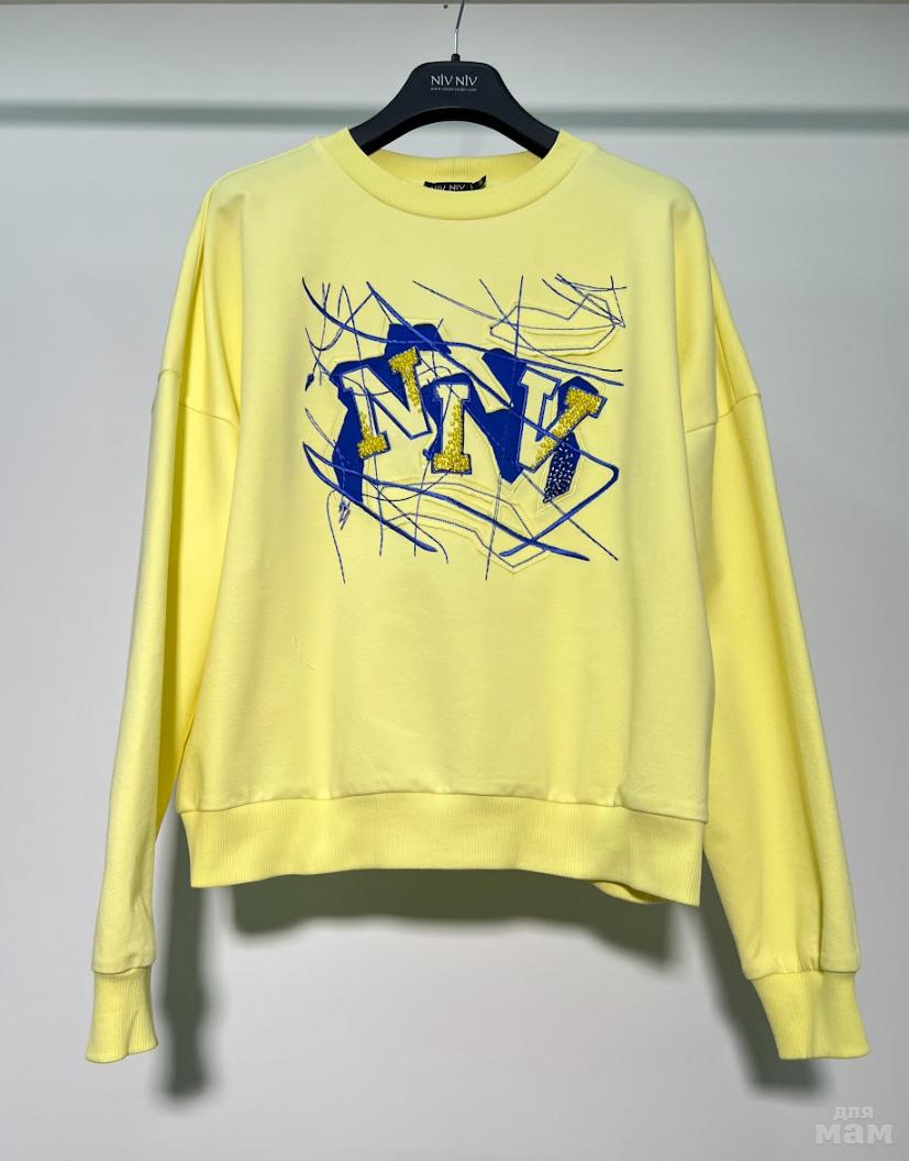Объемный свитшот из трикотажного премиального полотна ( двухнитка). Изделие прямое. Горловина круглая с притачной планкой из отделочной ткани. Рукав спущенный, длинный. Низ рукава на манжете из отделочной ткани. Низ изделия на планке из отделочной ткани. Перед и спинка изделия прямые. Низ ассиметричный. Спинка немного длиннее, чем перед. На передней половинке свитшота авторская вышивка.