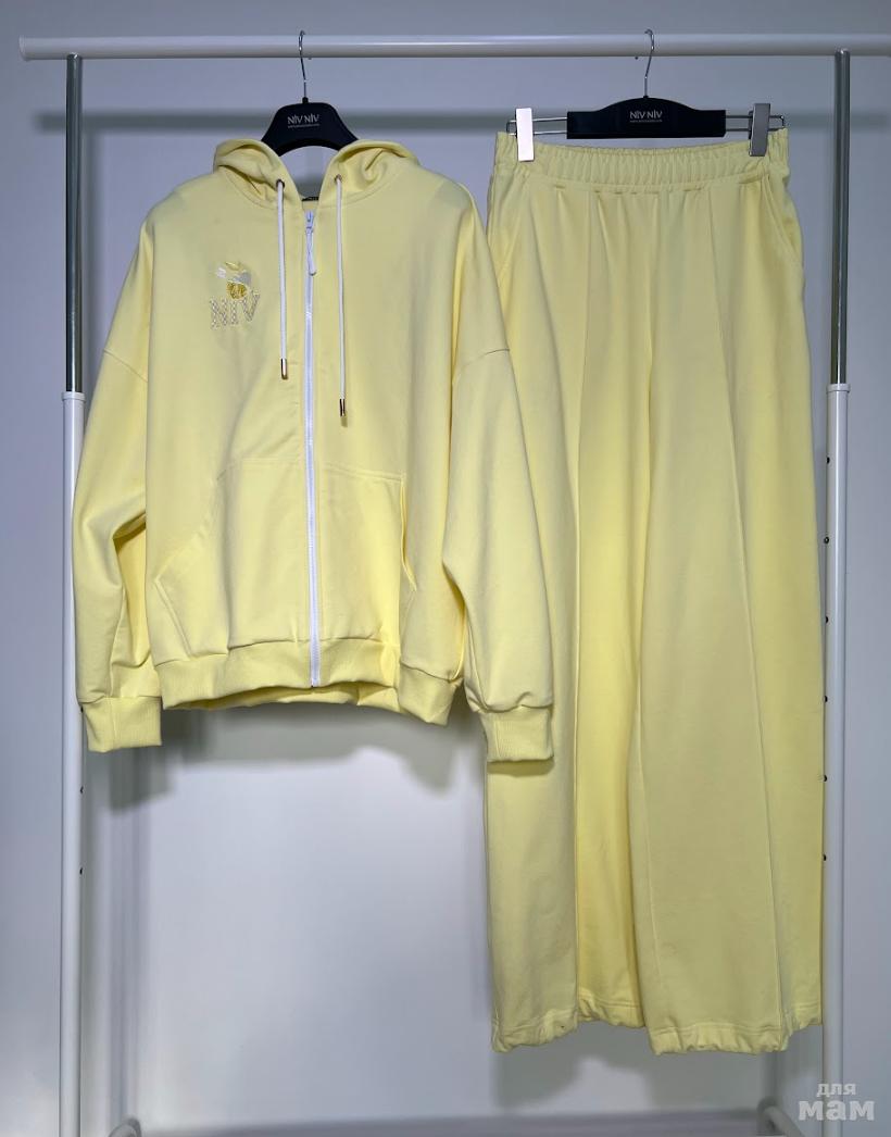 Спортивный костюм выполнен из премиального трикотажного полотна. Объемная “зипка” на молнии. Перед и спинка прямые. На полочке накладные карманы. Спущенная линия плеча. Низ рукава и низ изделия на манжете. По горловине - объемный капюшон. На полочке и на спинке дизайнерская вышивка.