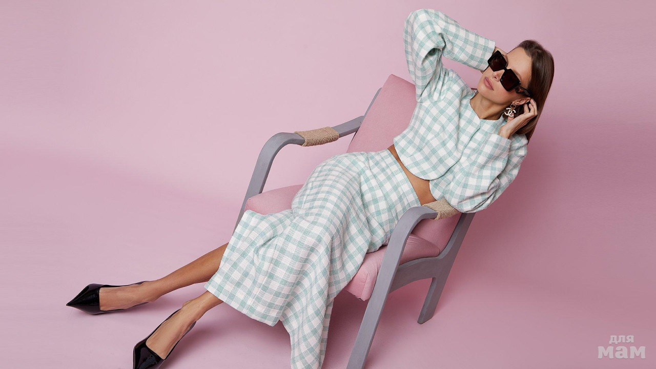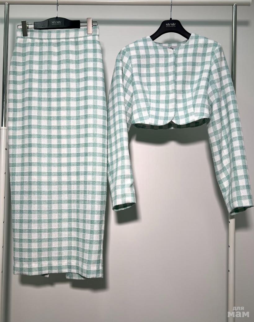 Стильный костюм, состоящий из жакета и узкой юбки. Жакет прямого силуэта, укороченный. Центральная бортовая застежка на потайные кнопки. Закругленная линия борта. Талиевые вытачки по переду и по спинке. Спинка со средним швом. Строгая, чуть удлиненная линия плеча. Рукав длинный ,объемный. Изделие на подкладке