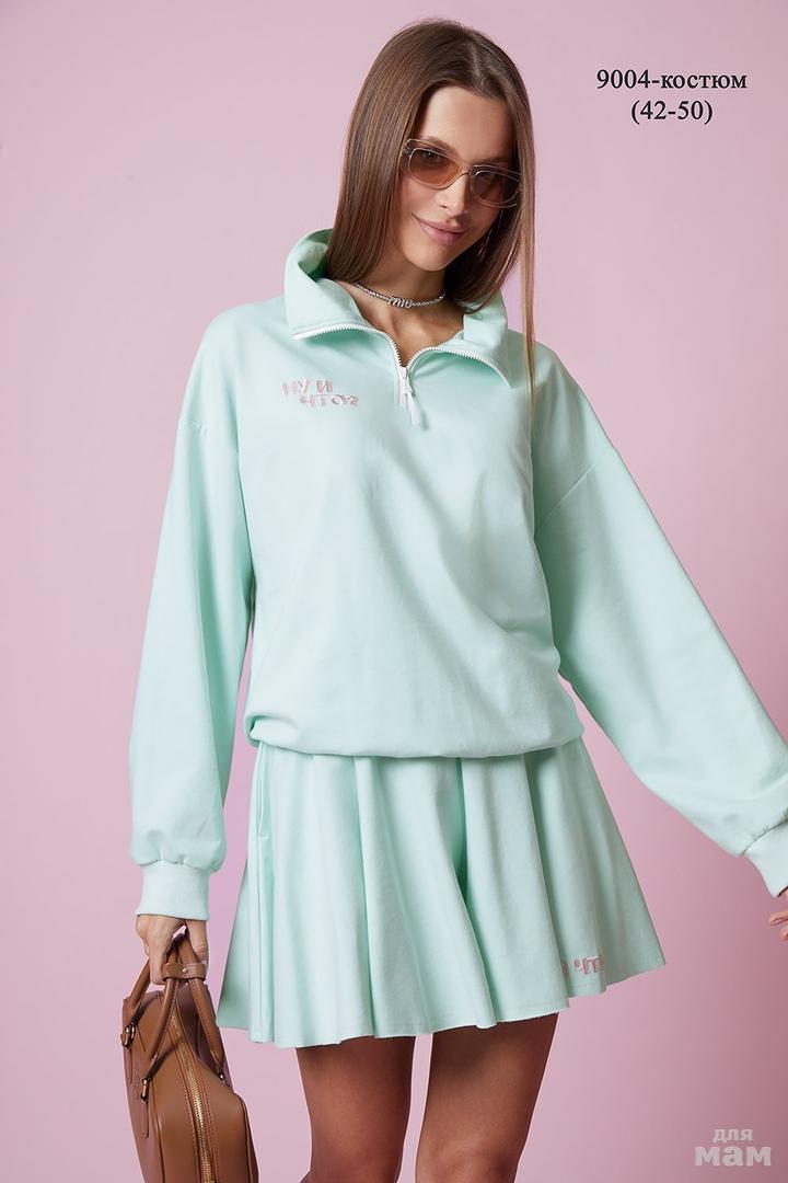 Костюм, выполнен из премиального трикотажного полотна, состоящий из свитшота и шорт (юбка-шорты). Свитшот прямого силуэта, перед и спинка изделия прямые, спущенная линия плеча. Горловина - высокая стойка на молнии. Низ рукава и низ изделия на притачной манжете. Юбка - шорты на резинке. Карманы в боковых швах. Низ шорт с необработанным краем. Дизайнерская вышивка на свитшоте и на юбке .