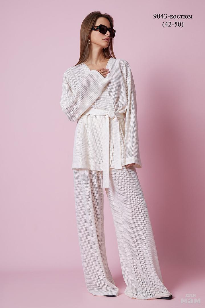 Элегантный комплект, состоящий из брюк и кардигана. Кардиган прямого силуэта, длиной до бедер. Изделие без застежки и без воротника. Спущенная линия плеча. Свободный длинный рукав, немного расширенный книзу. Спинка прямая. Изделие без подкладки. Брюки прямые, свободного кроя. . Брюки на резинке (без застежки). Карманы в боковых швах.