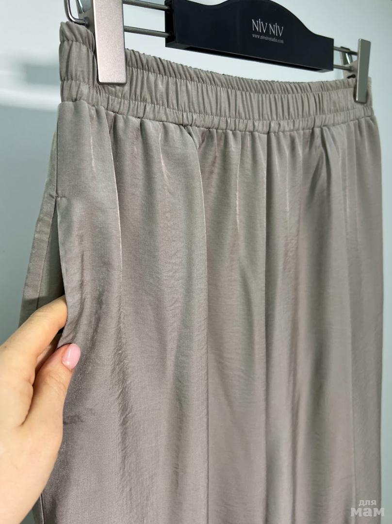 Летние струящиеся брюки из вискозы (тенсил) прямого силуэта. Брюки без застежки. Карманы в боковых швах. По талии декоративная “брендированная” резинка. Спереди застрочены декоративные канты.