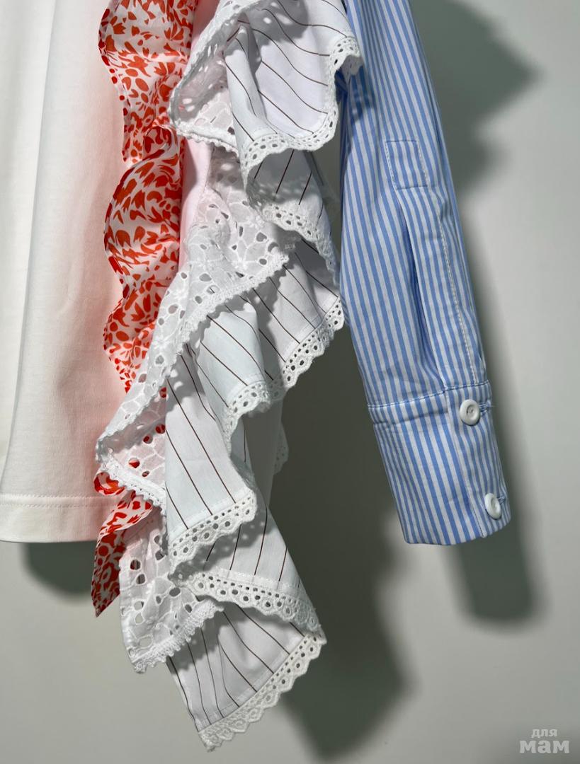 Футболка-блуза оверсайз выполнена из плотного хлопкового трикотажного полотна (интерлок). Рубашечный рукав. Горловина круглая с притачной планкой. Низ рукава с притачной манжетой. Вертикальные рельефы на полочке и на спинке изделия, в которые вставлены декоративные элементы из различных видов тканей, декорированные хлопковым кружевом. Дизайнерский принт на передней половинке футболки.
