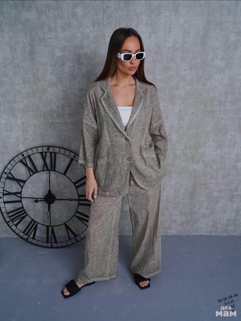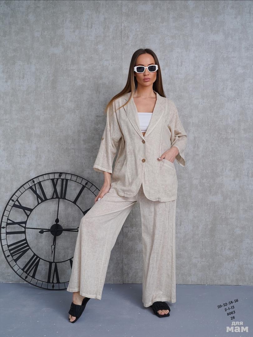 Женский костюм- двойка. Качество отличное . 2-1-13 8063 28. Материал хлопок 100%, из льна. Посадка высокая , рост модели 170 . ЦЕНА 2800 РУБ