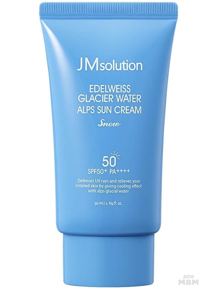 Охлаждающий безмасляный санскрин Jmsolution Edelweiss Glacier Water Alps Sun Cream Snow SPF50+ PA++++ блокирует УФ-излучение, успокаивает раздражённую кожу, питает и увлажняет.