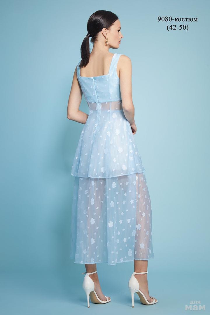 Костюм состоит из удлиненной блузы и юбки. Блуза полуприлегающего силуэта. По переду рельефы и средний шов. По спинке также рельефы и средний шов, в который вставлена потайная молния. Фигурный вырез горловины.