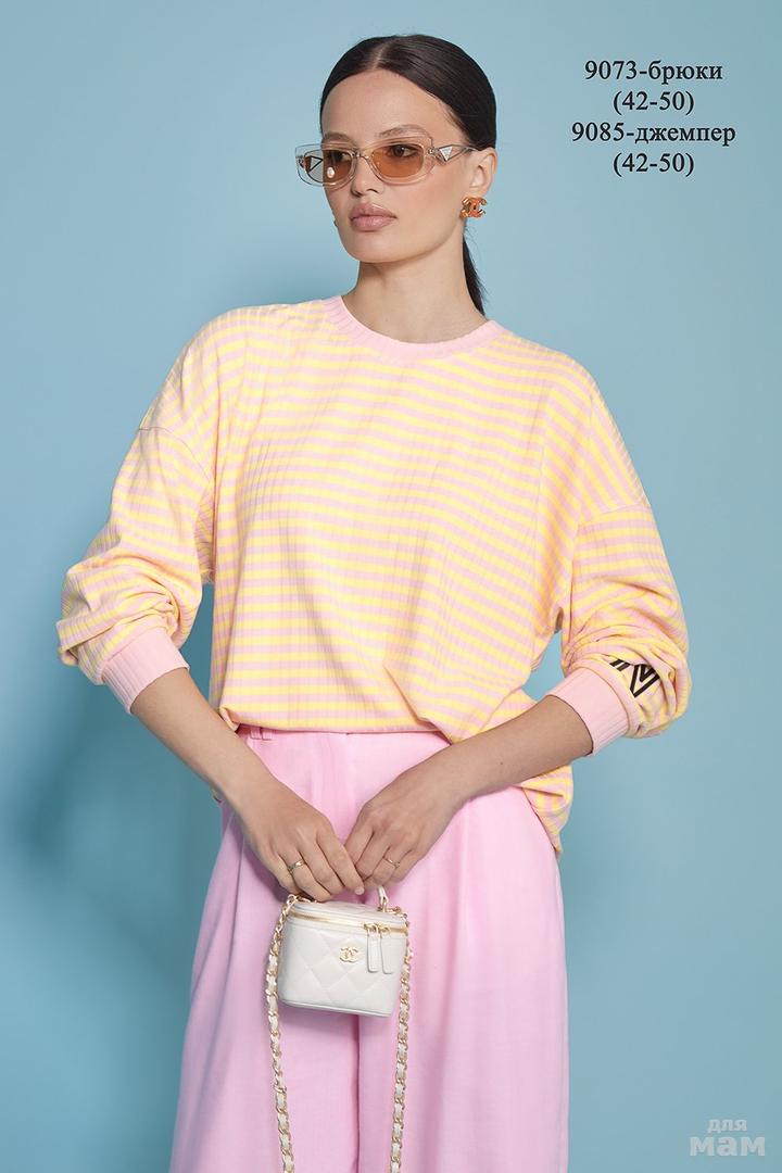 Джемпер прямого силуэта из вискозного трикотажного полотна в полоску. Перед и спинка изделия прямые. Горловина круглая с притачной планкой из отделочной ткани. Рукав втачной, короткий. Низ рукава на манжете из отделочной ткани.