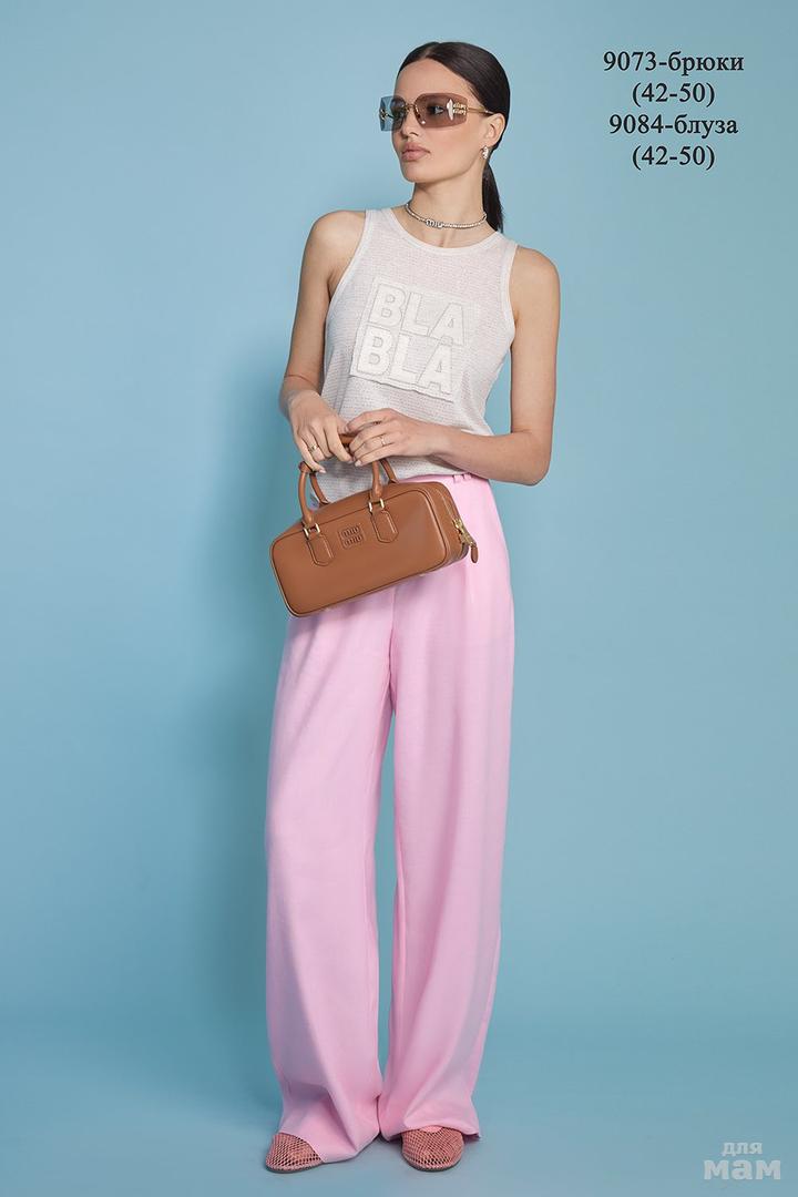 Прямые брюки из фактурной вискозы. Спокойный умеренный объем. Брюки средней посадки на поясе. Функциональные прорезные карманы в боковых швах. Сзади прорезные карманы в рамку – обманки. По переду по одной односторонней складке.