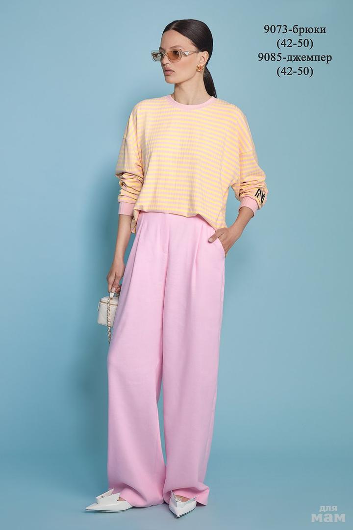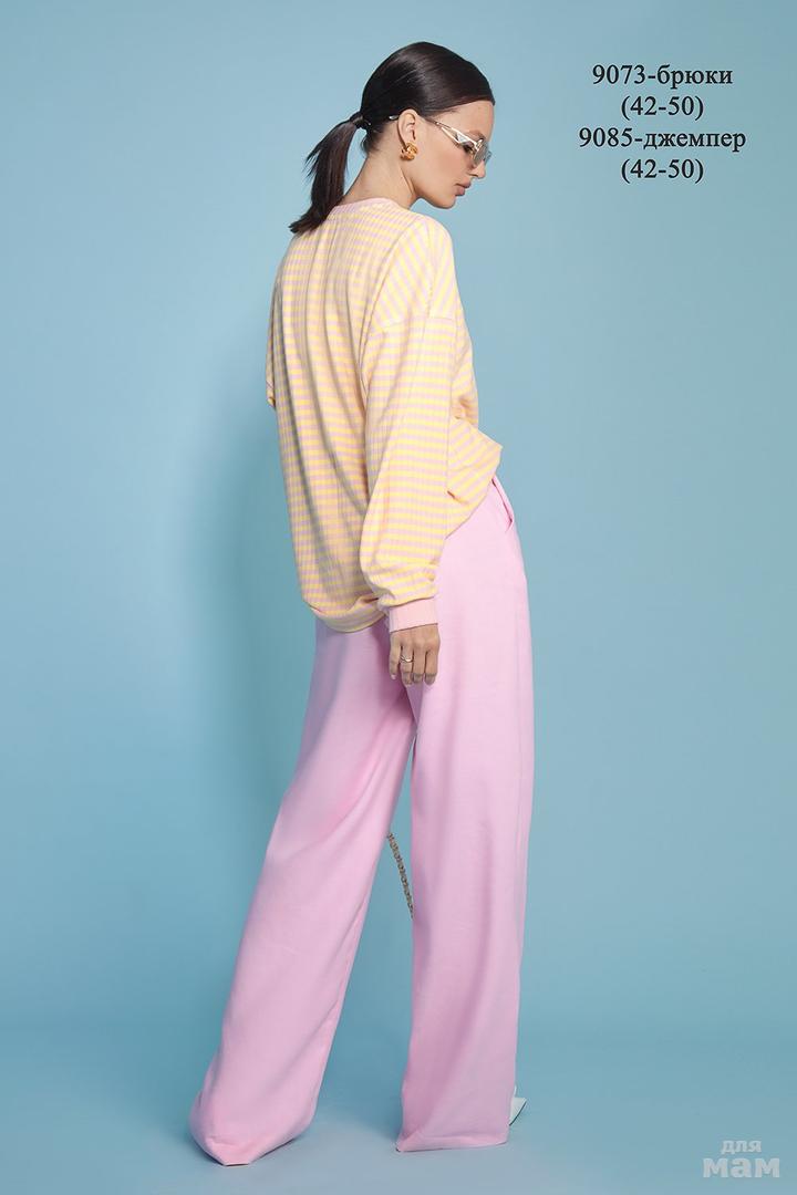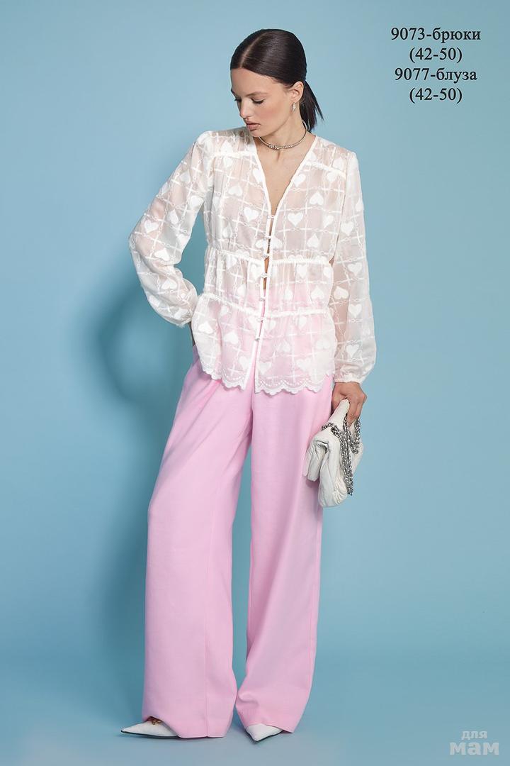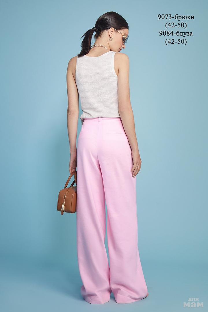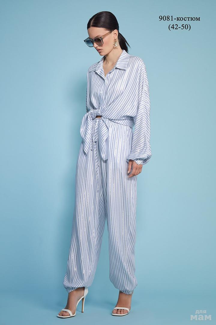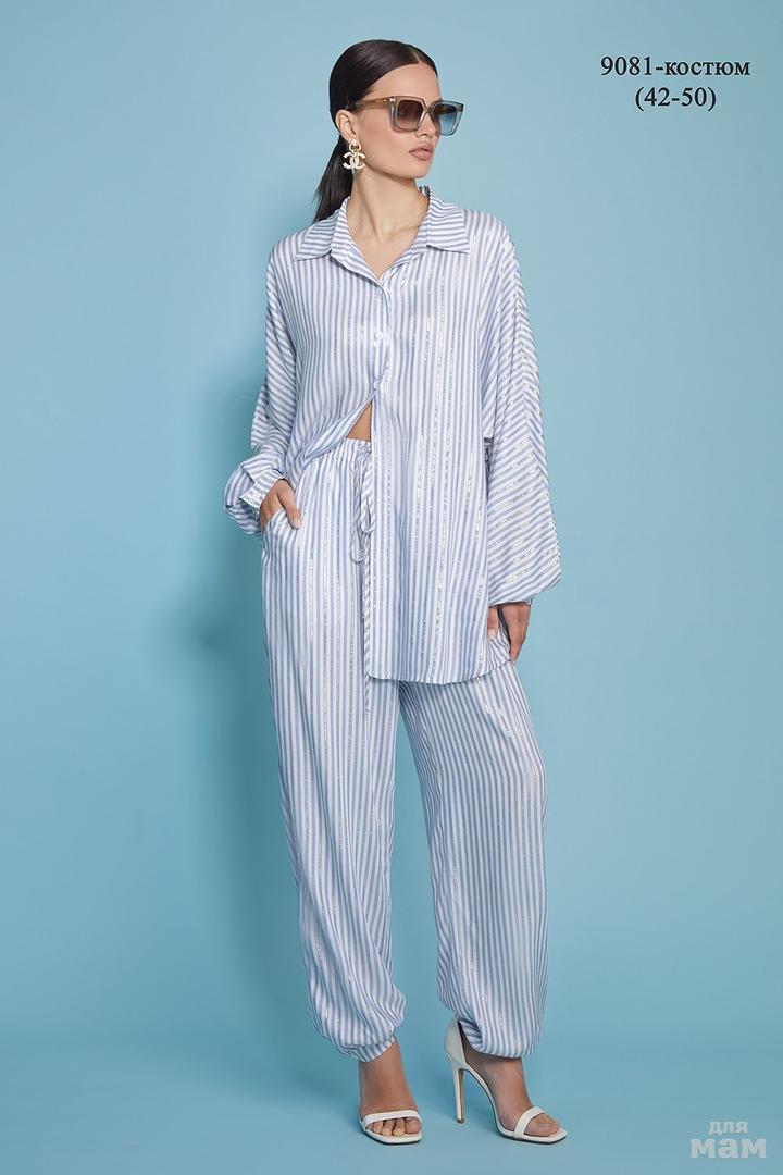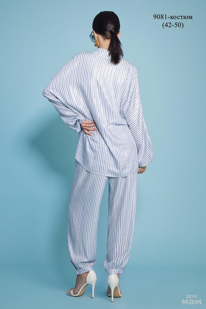 Элегантный комплект, состоящий из брюк и рубашки. Рубашка прямого силуэта, длиной до бедер. Центральная бортовая застежка на 3 петли и пуговицы. Воротник рубашечный. Спущенная линия плеча. Свободный рукав , немного расширенный книзу. Низ рукава на притачной манжете.. Спинка прямая. Изделие без подкладки. Брюки прямые, свободного кроя, без подкладки. Брюки на резинке (без застежки). Карманы в боковых швах. Низ брюк на притачной манжете. По боковому шву небольшой декоративный разрез.