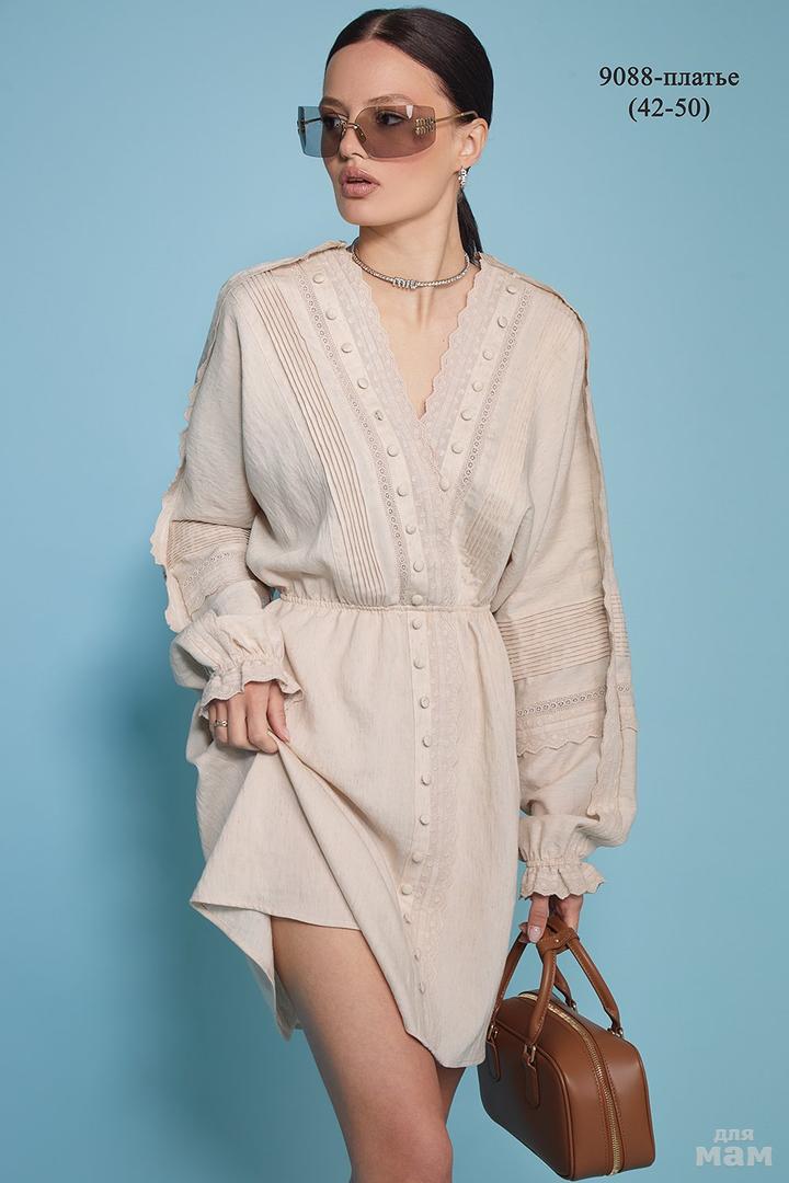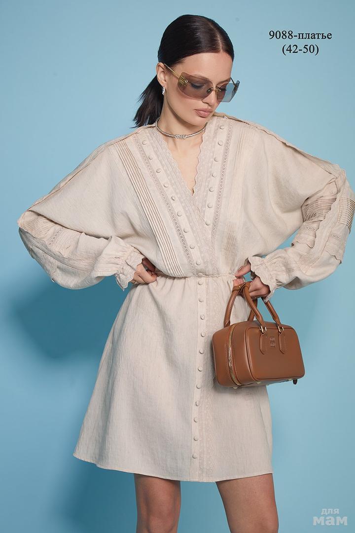 Стильное платье, выполнено из мягкого льна. Изделие без застежки, отрезное по линии талии. По талии вставлена резинка. Цельнокроеный рукав. Перед и спинка с многочисленными защипами, складками, подрезами, в которые вставлено декоративное кружево. На рукавах также защипы, подрезы и кружево. V-образные вырезы по переду и по спинке. Сзади изделие фиксируется шнурком.