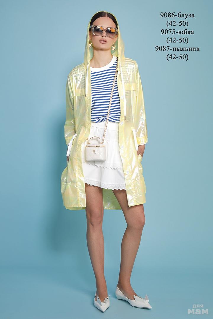 Пыльник выполнен из тонкой плащевой ткани с эффектом бензина. Изделие прямого силуэта,длина выше колена. Центральная бортовая застежка на петли и пуговицы. По переду отрезная планка, горизонтальная кокетка и прорезные карманы. Спинка прямая с отрезной горизонтальной кокеткой. Спущенная линия плеча. Прямой рукав, длиной 7/8. Низ рукава с притачной манжетой из отделочной ткани. По талии выполнена кулиса ,в которую вставлен декоративный шнурок. Горловина оформлена капюшоном. Низ изделия ассиметричный.