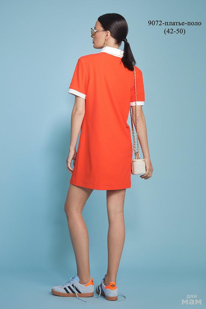 Платье- поло стандартного прямого кроя, выполнено из премиального трикотажного полотна. Изделие обозначает фигуру, не облегая ее. Перед и спинка прямые. Воротник с тремя пуговицами. Втачной короткий рукав. Воротник и манжеты рукава выполнены из отделочной ткани.