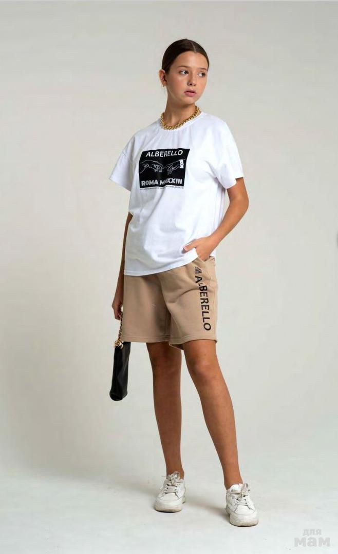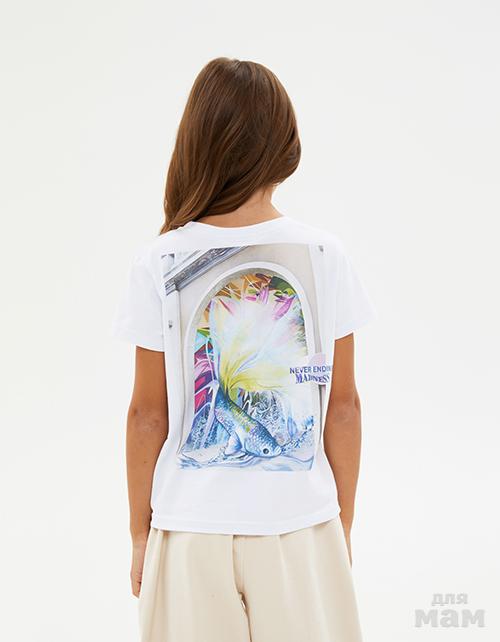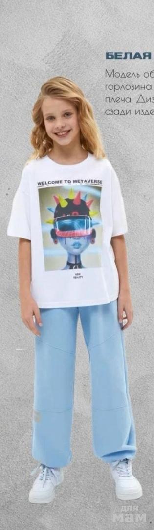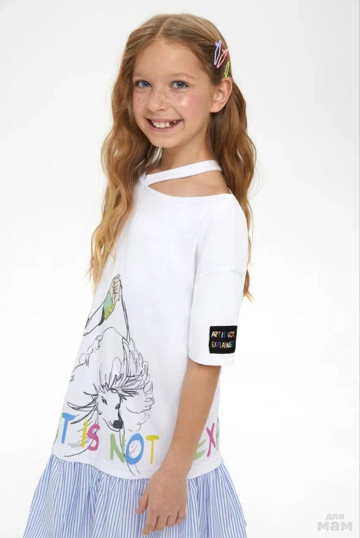 Дизайнерская белая футболка для девочки. Модель прямого силуэта.С дизайнерским принтом.Размеры в наличии134,146,140,158, Цена 800 руб