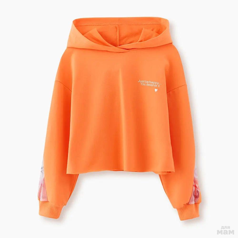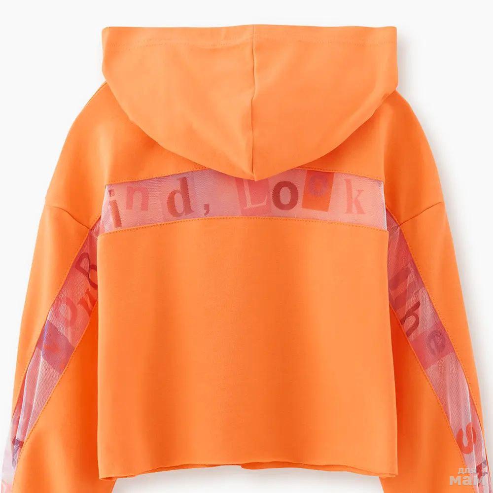 Очень красивое худи в сочном апельсиновом цвете, низ изделия необработан, смотрится эффектно, прозрачные надписи на сетке на спинке! Очень эффектный костюм с брюками палаццо (ниже)