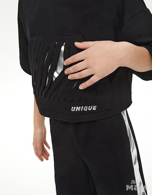 Нарядный укороченный джемпер для девочки. Объёмный силуэт, спущенная линия плеча, удлинённый рукав до локтя. Карман-кенгуру с декоративными разрезами с подложкой серебро. Размеры в наличии 146.Цена 1250 руб.