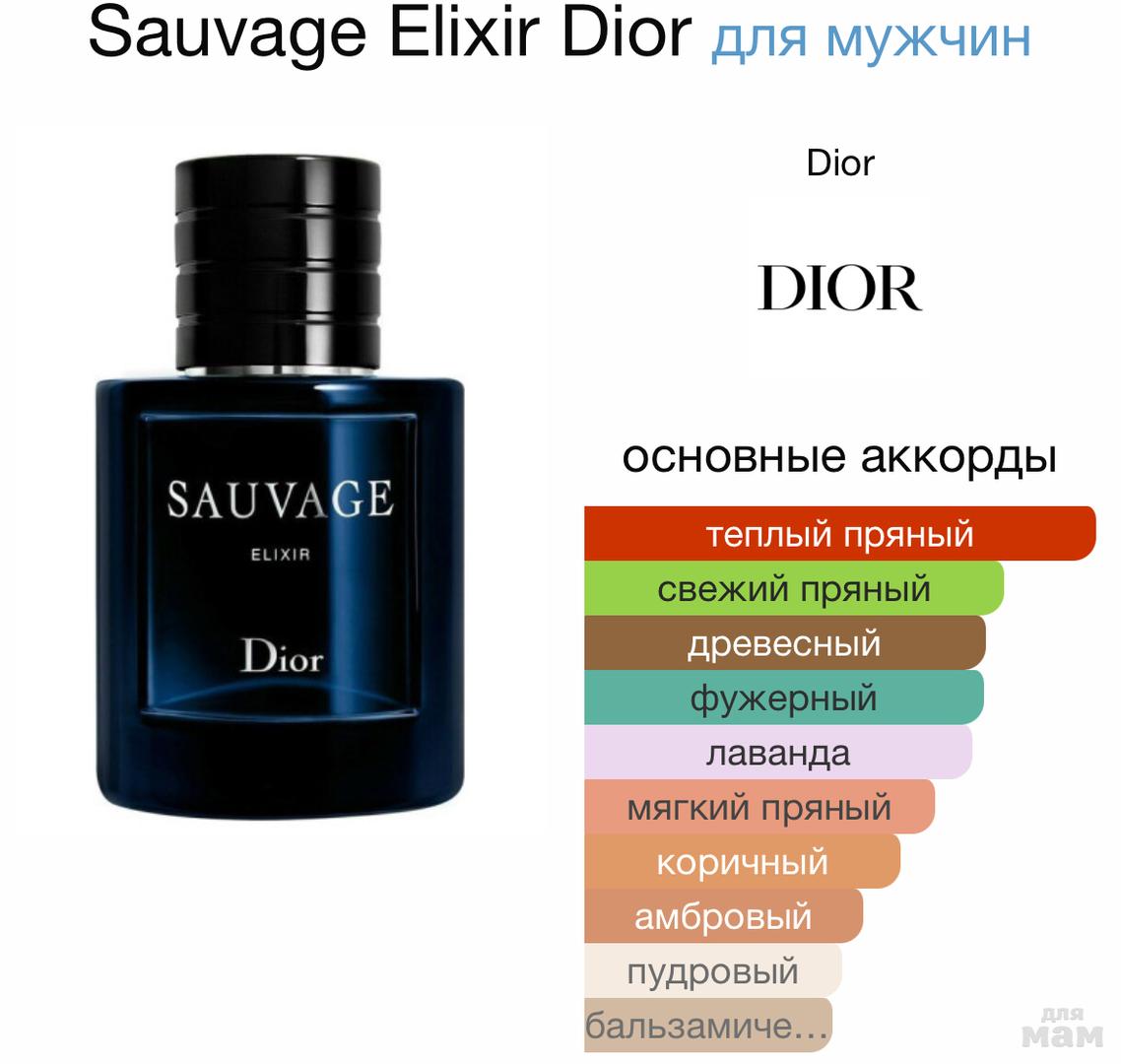В верхнем аккорде парфюма Christian Dior Sauvage Elixir царит свежий цветочный аромат душистой лаванды. Яркий аккорд экзотический специй, звучащий в сердце парфюма, придает композиции особую пикантность. А горьковато-дымный запах смолистой хвои и тепло древесных нот уравновешивают композицию, вносят в нее гармонию и уникальный стиль.