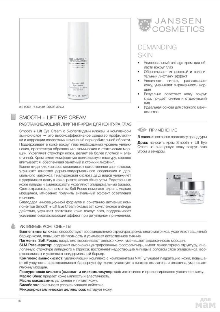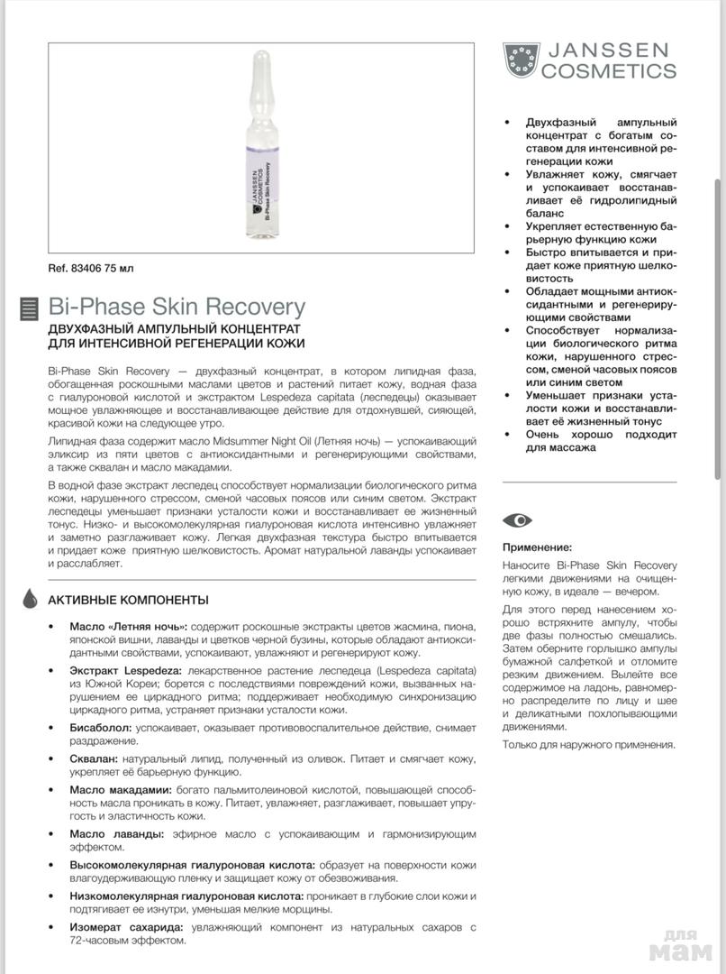 и эластичность, заметно разглаживают морщины. Уменьшается трансэпидермальная потеря влаги, мгновенно стабилизируется уровень увлажненности, нормализуется рН, восстанавливается прочность эпидермального барьера. Ценное масло жожоба, комплекс витаминов Е и биотин в липидной фазе восстанавливают, смягчают, разглаживают и подтягивают Высокоэффективные anti-age ингредиенты оказывают антиоксидантное действие и укрепляют защитные функции кожи, предотвращая её преждевременное старение. Предназначена для домашнего применения. Рекомендуется для кожи преимущественно сухого и комбинированного типа.