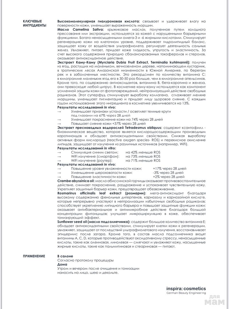 Результат: увлажненная, гладкая, упругая, ухоженная кожа, сияющий и свежий цвет лица.