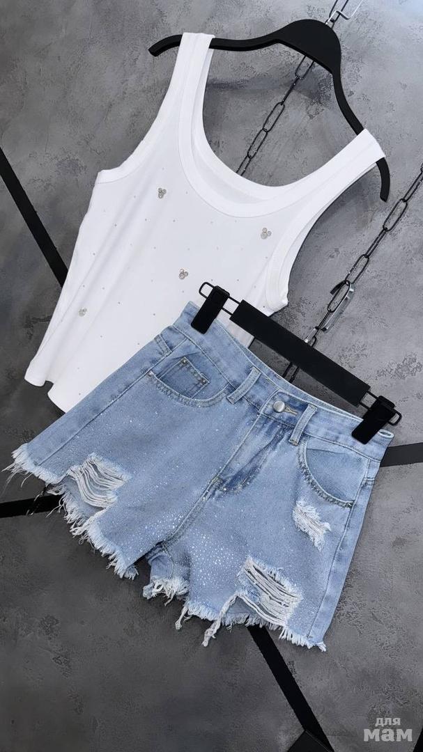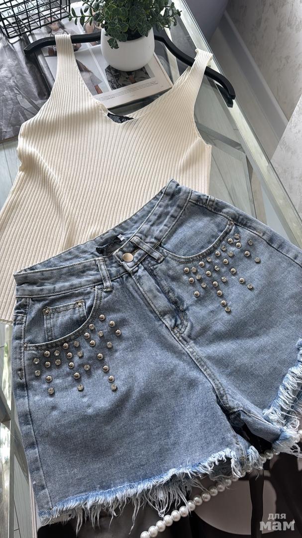 Джинсовые шорты с камешками. Отличное качество, длина 34 см, чем больше размер, тем чуть длиннее. ЦЕНА 800 РУБ