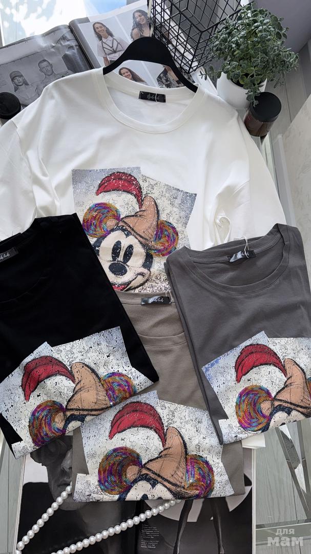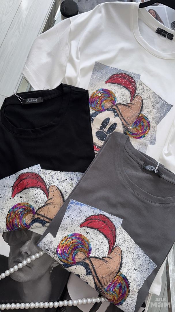 Стильная футболка с ярким принтом - отличный выбор для тех, кто хочет выразить свою индивидуальность. Декор из пайеток. Длина изделия 71 см. Полуобхват груди 58 см. Стиль Оверсайз. ЦЕНА 800 РУБ