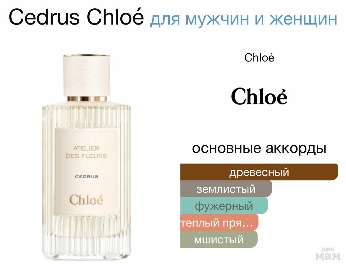Композиция аромата Chloe «Cedrus» отличается лаконичностью и включает в себя ноты пикантного кардамона, элегантных древесных нюансов, мха, изысканного сандала и насыщенного ветивера.