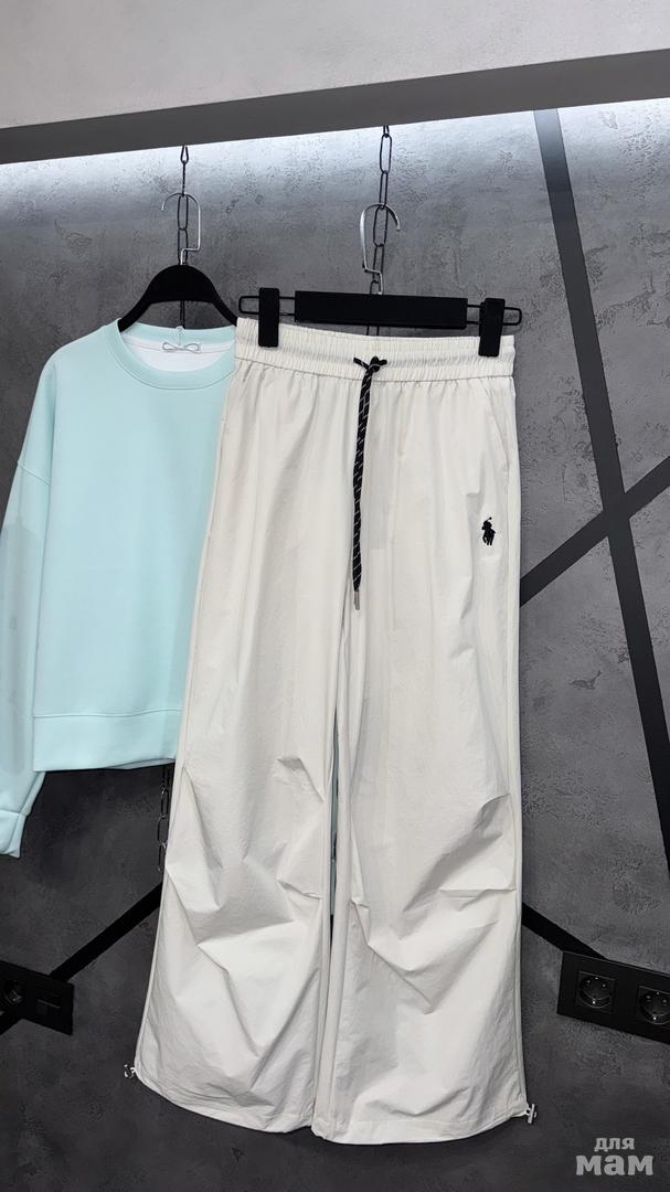 Классные легкие штаны с регулировкой внизу: можно носить как палаццо, так и затянуть под манжет. Фото реальное, отличное фабричное качество. Рабочие кармашки, лого бренда вышит . ЦЕНА 950 РУБ