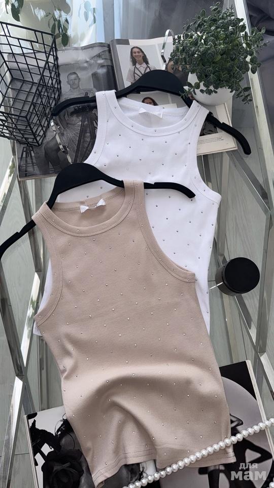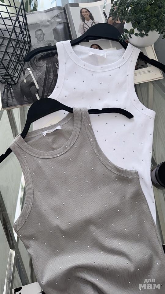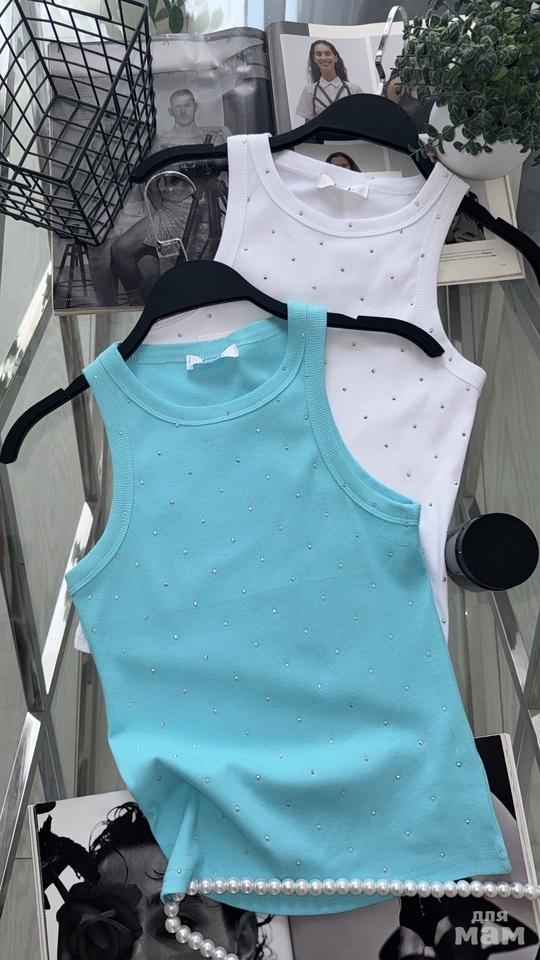 Майка с камешками отличное решение как самостоятельно, так и для первого слоя в образе.Отличное качество. Длина 52 см. ЦЕНА 550 РУБ