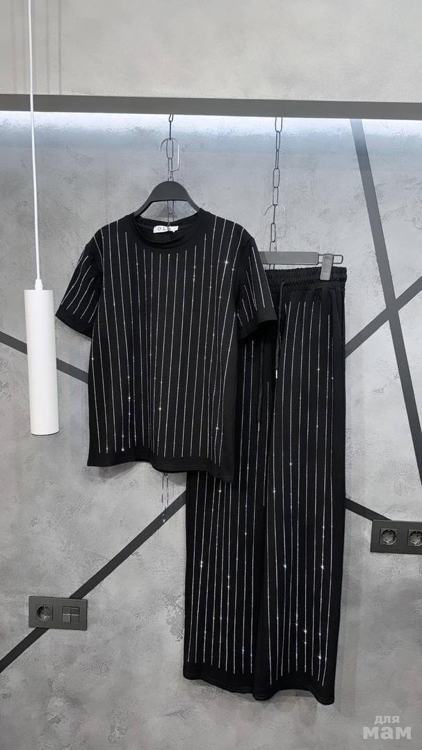 Классные костюмы-двойки с брюками палаццо со стразинками. Фото сделаны в живую, есть рабочие кармашки, длина штанов 104 см, верх 60 см. P.S камешки в цвет костюма . ЦЕНА 1800 РУБ