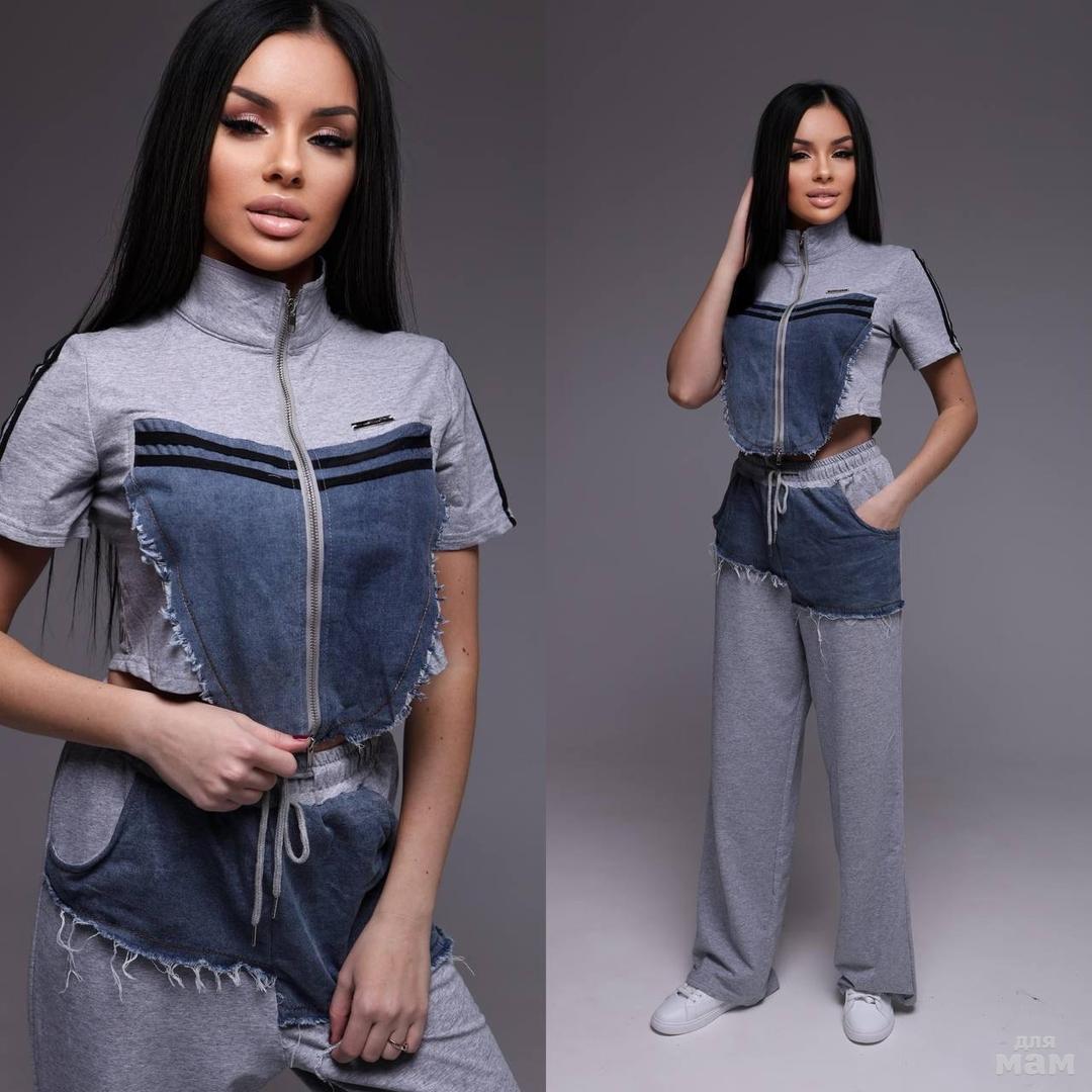 Комбинированные костюмы с джинсой в стиле спортшик. Качество супер ! Фото сделаны нами-полное соответствие. Длина топа 41 см, длина штанов 106 см . ЦЕНА 1300 РУБ