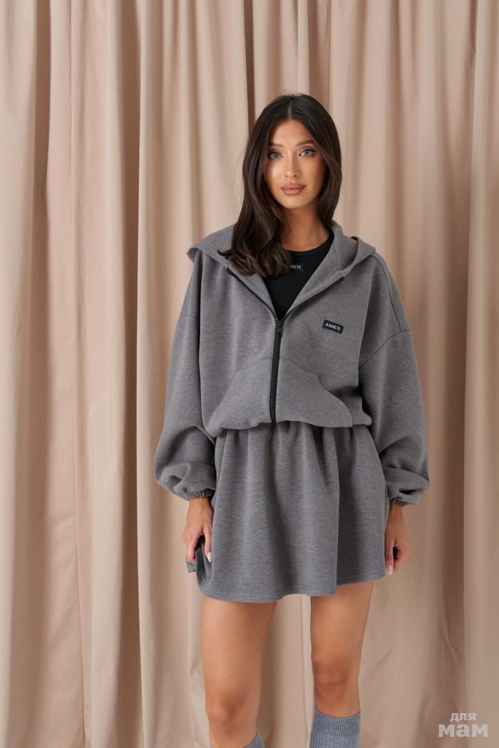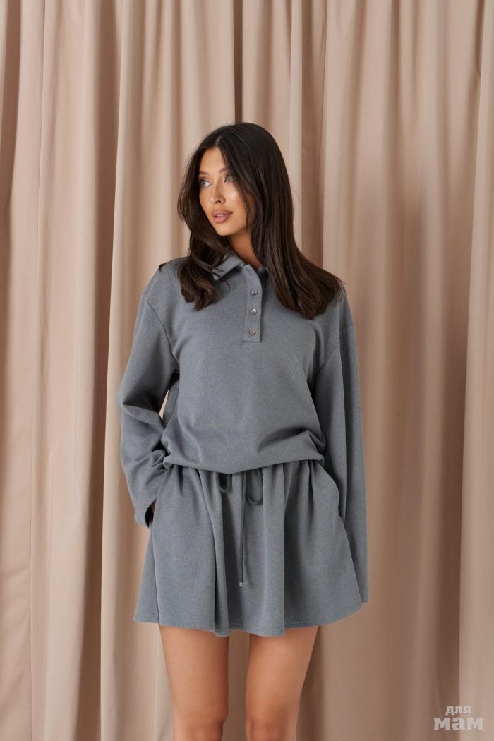 Юбка-мини свободного кроя. Выполнена из плотного трикотажа серого цвета. Без подкладки. Пояс не резинке со шнурком. Без застёжки. В боковых швах карманы. Длина юбки по боковому шву 38,5 см