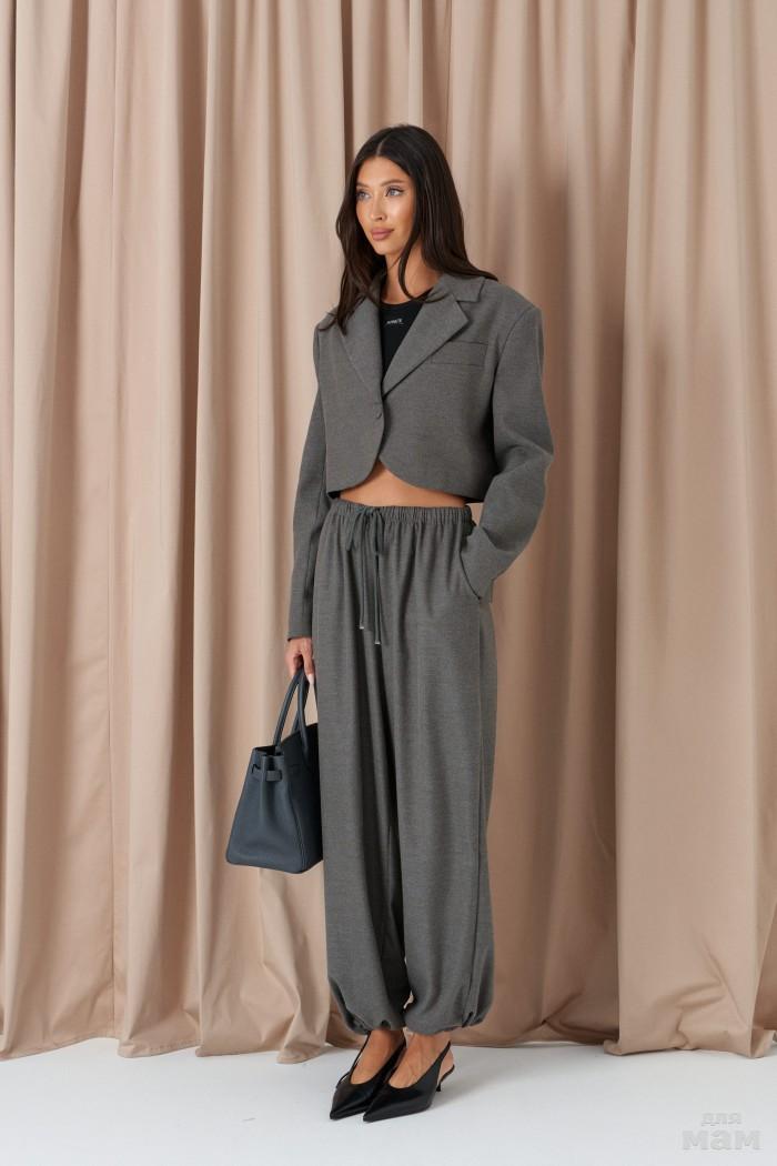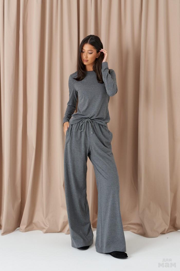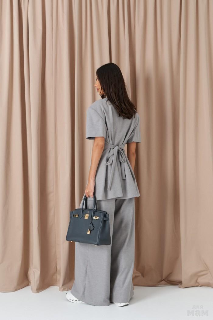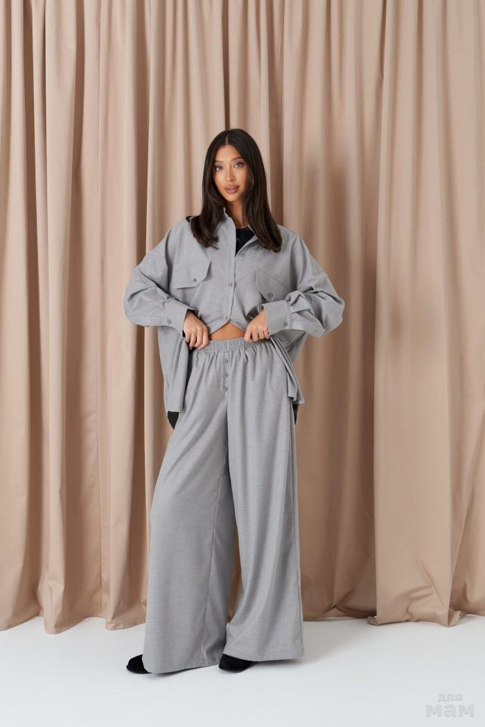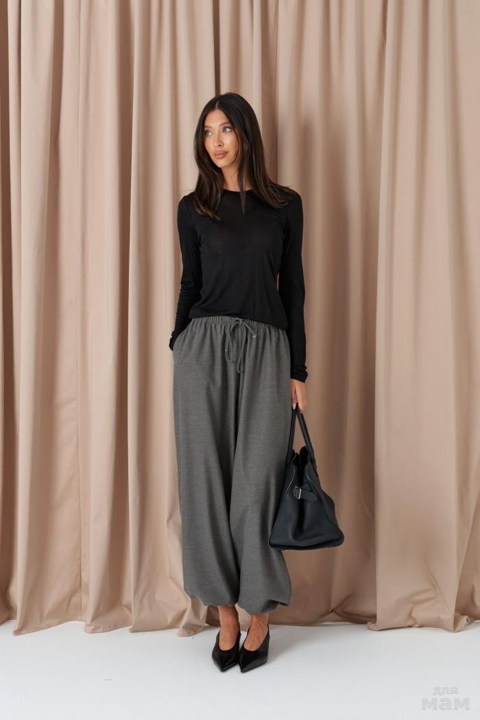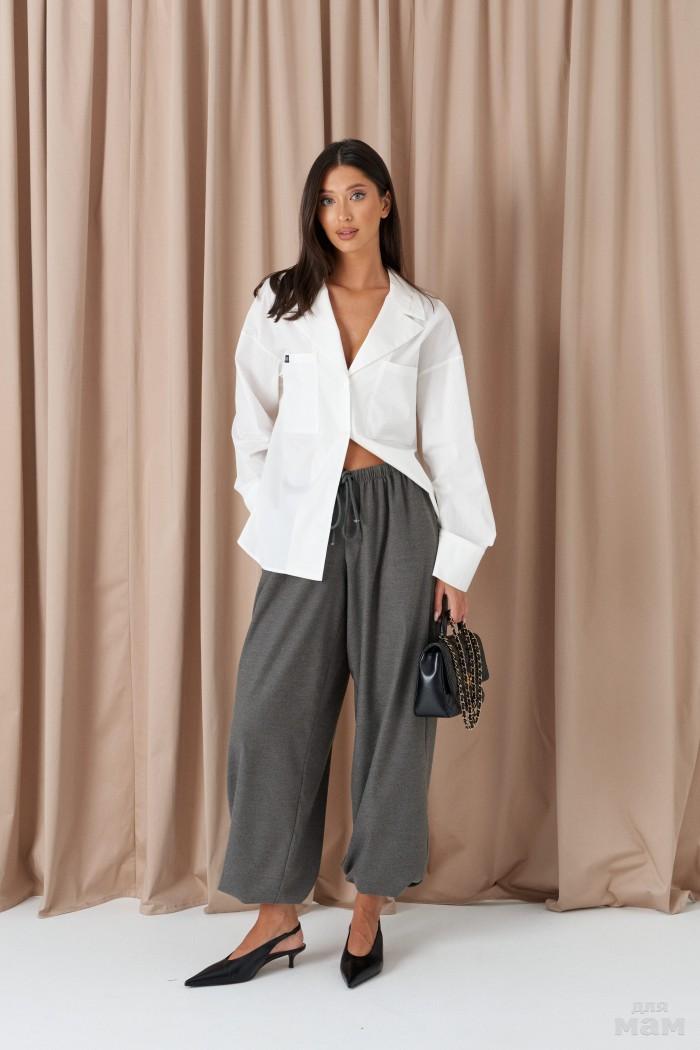 Брюки свободного кроя. Выполнены из костюмной ткани светло-серого цвета. В боковых швах карманы с отрезным бочком. Пояс на резинке. На Поясе имеются декоративные строчки. По переду имеется имитация застёжки. Длина 109 см