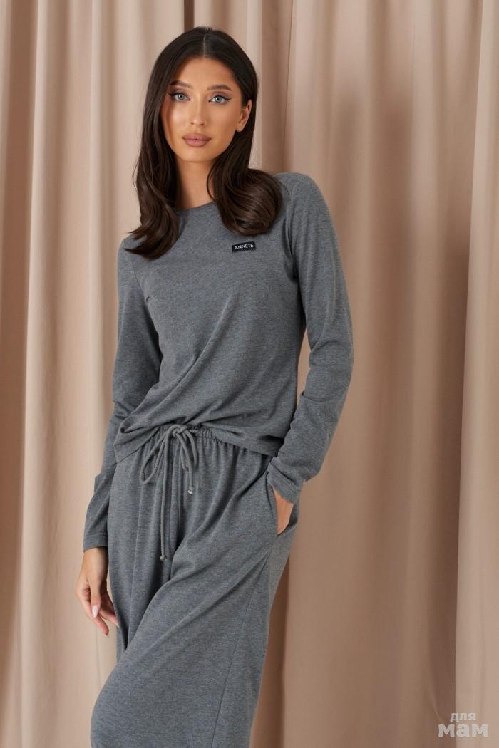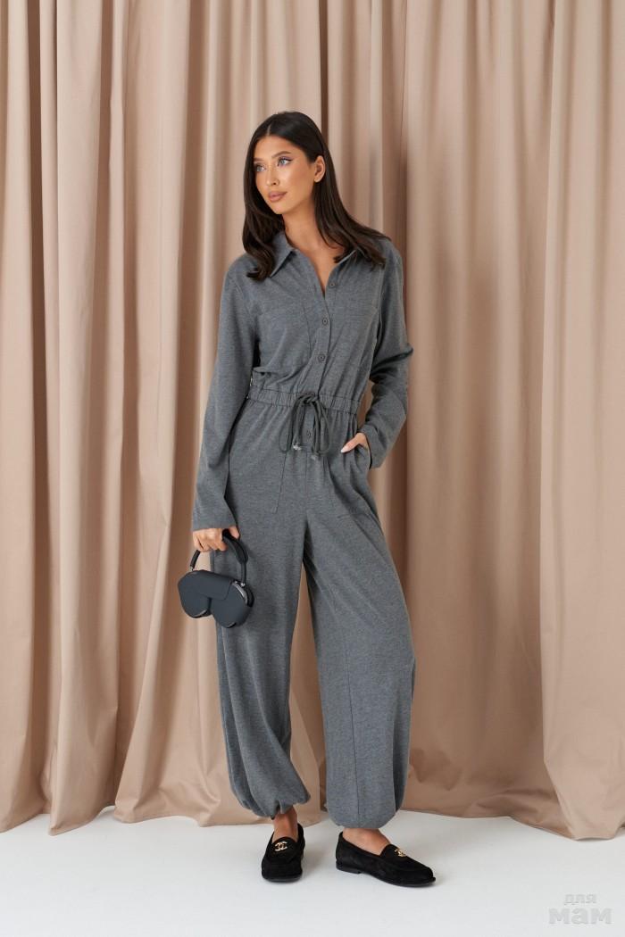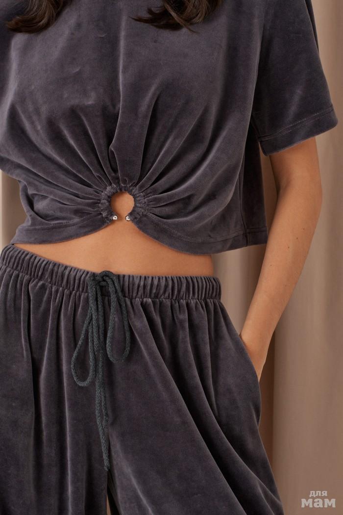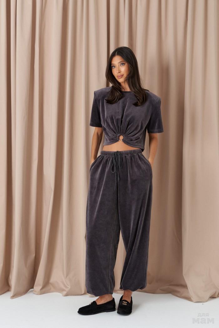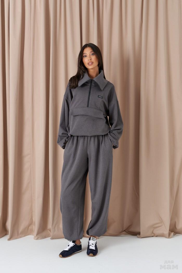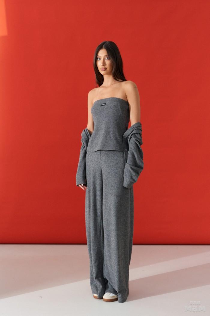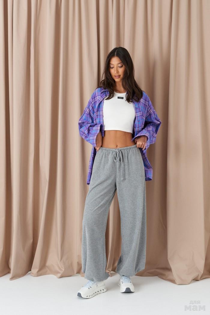 Брюки свободного кроя. Выполнены из костюмной ткани светло-серого цвета. В боковых швах карманы с отрезным бочком. Пояс на резинке. На Поясе имеются декоративные строчки. По переду имеется имитация застёжки. Длина 109 см