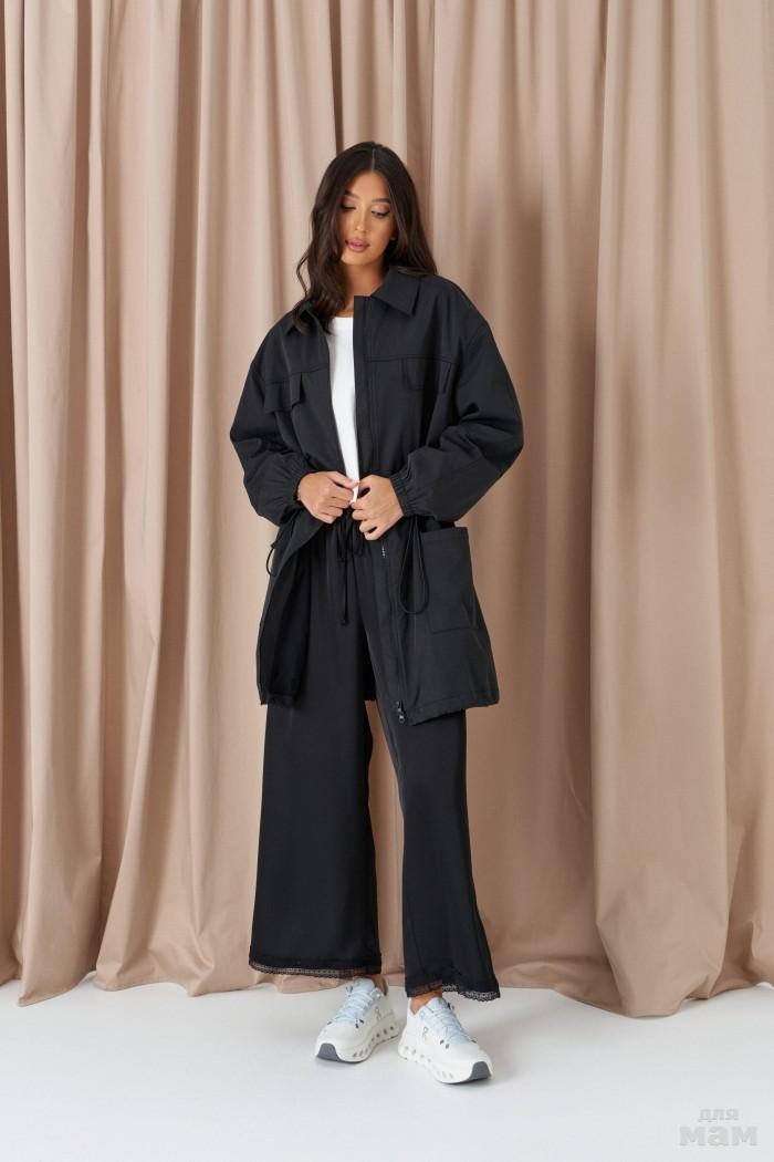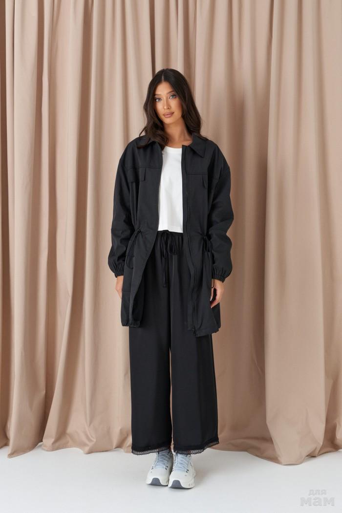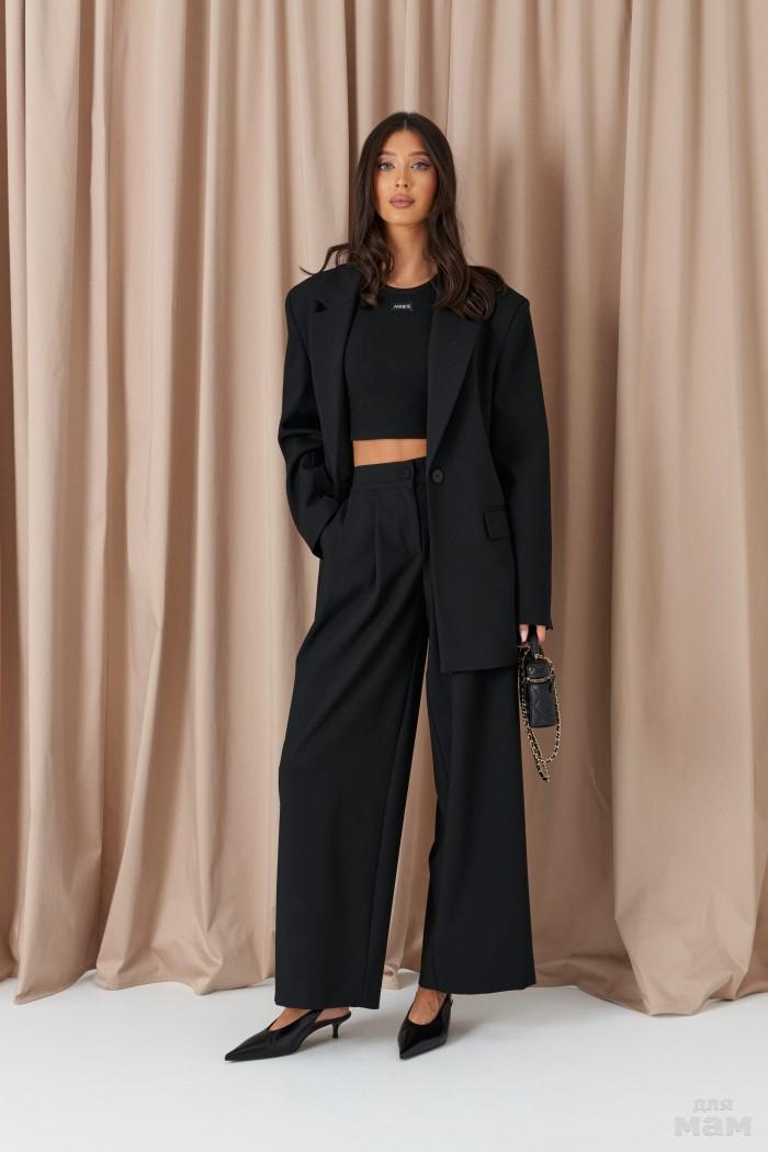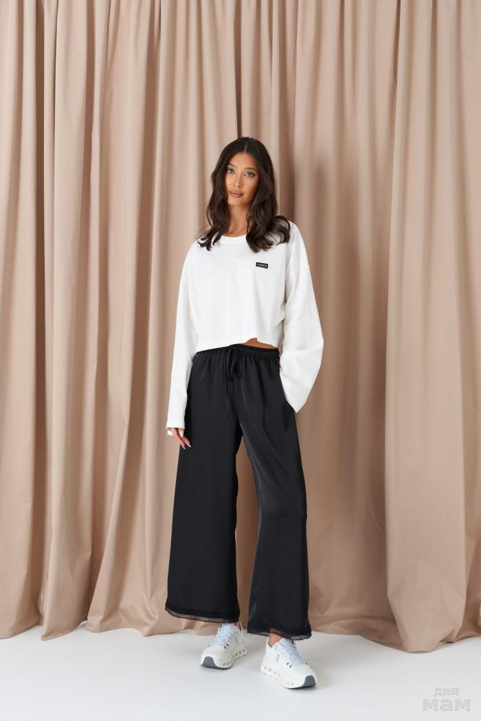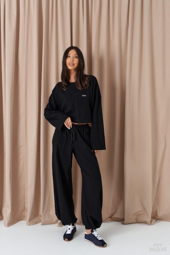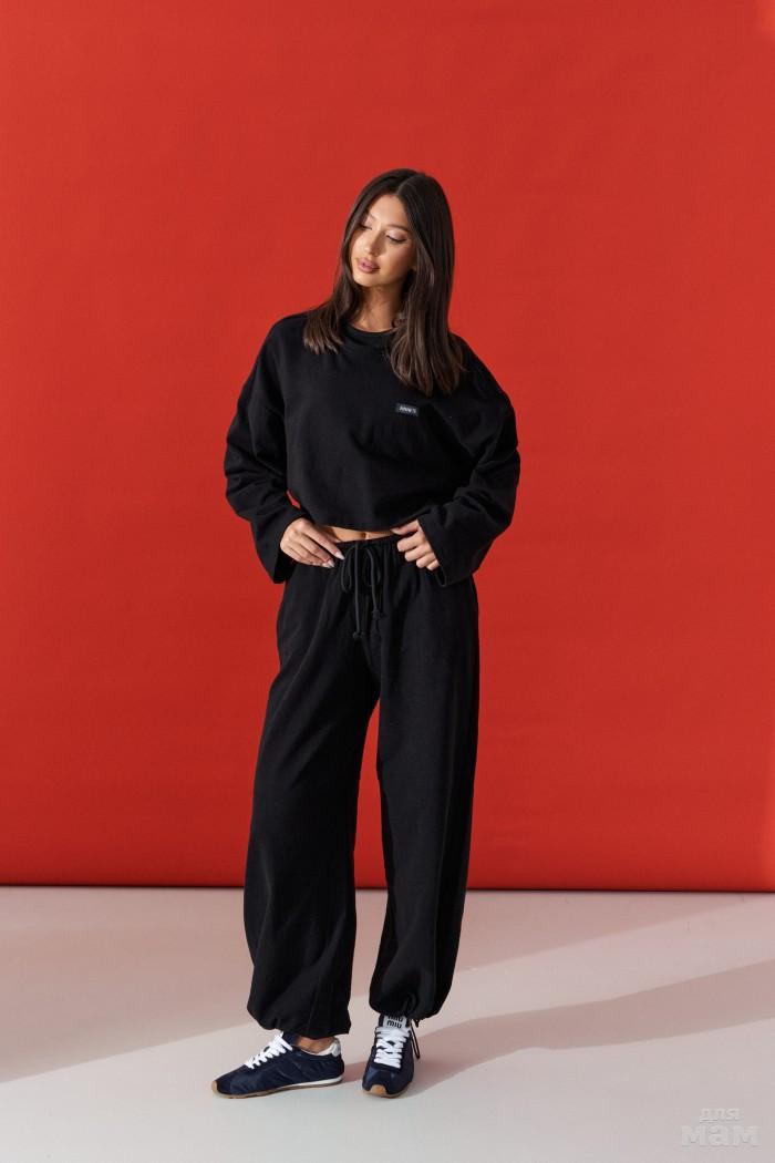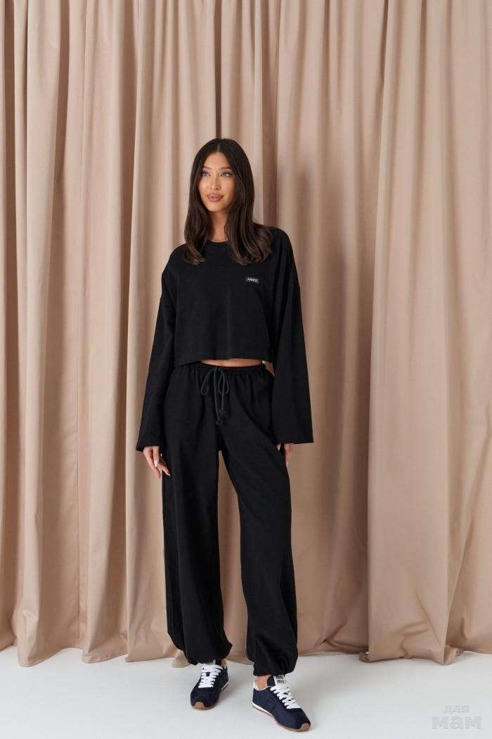 Брюки прямого свободного кроя, выполены из трикотажного полотна черного цвета. Характеристики: прямой крой, пояс на резинке с кулиской, в боковых швах карманы, штанина внизу на резинке с фиксатором. Длина 107см.